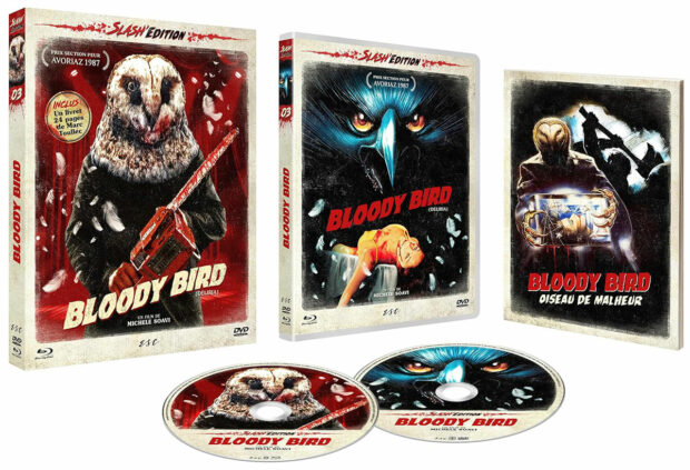 Le Blu-ray de Bloody Bird, édité par ESC Films dans la collection « Slash’Édition », se présente dans un packaging soigné, fidèle à l’esthétique sanglante et théâtrale du film. Le boîtier adopte cette charte graphique reconnaissable, mélange de couleurs vives et de textures légèrement granuleuses, comme si l’objet lui-même avait été retrouvé dans une loge poussiéreuse. Côté technique, l’image proposée par cette édition rend justice au travail de Michele Soavi : les contrastes sont solides, les noirs profonds sans être bouchés, et les couleurs retrouvent cette saturation légèrement irréelle qui caractérise le cinéma d’horreur italien des années 80. Les détails du décor – rideaux, planches, costumes – ressortent avec une précision appréciable, même si quelques plans nocturnes montrent une granulation plus marquée. Côté son, Bloody Bird bénéficie de plusieurs pistes DTS-HD Master Audio 2.0 : la version française, la version italienne et la version anglaise. La version italienne reste la plus naturelle, avec une spatialisation modeste mais efficace, des dialogues clairs et une musique bien intégrée. La version française, typique des doublages de l’époque, offre un charme rétro indéniable, même si certaines voix semblent légèrement détachées de l’action. La version anglaise, quant à elle, propose un mixage propre mais parfois un peu sec. Dans l’ensemble, les trois pistes permettent d’apprécier pleinement l’ambiance sonore de Bloody Bird, notamment les bruits de coulisses, les craquements du plateau et les respirations du tueur, qui gagnent en présence grâce à la dynamique du format.