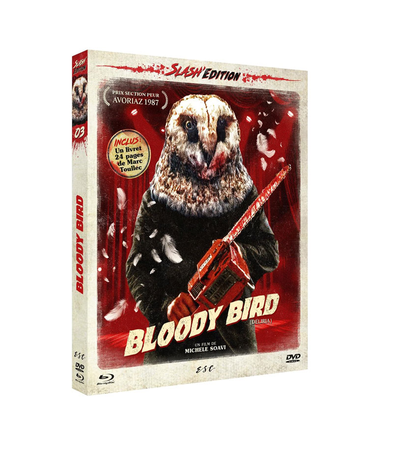 Le Blu-ray de Bloody Bird, édité par ESC Films dans la collection « Slash’Édition », se présente dans un packaging soigné, fidèle à l’esthétique sanglante et théâtrale du film. Le boîtier adopte cette charte graphique reconnaissable, mélange de couleurs vives et de textures légèrement granuleuses, comme si l’objet lui-même avait été retrouvé dans une loge poussiéreuse. Côté technique, l’image proposée par cette édition rend justice au travail de Michele Soavi : les contrastes sont solides, les noirs profonds sans être bouchés, et les couleurs retrouvent cette saturation légèrement irréelle qui caractérise le cinéma d’horreur italien des années 80. Les détails du décor – rideaux, planches, costumes – ressortent avec une précision appréciable, même si quelques plans nocturnes montrent une granulation plus marquée. Côté son, Bloody Bird bénéficie de plusieurs pistes DTS-HD Master Audio 2.0 : la version française, la version italienne et la version anglaise. La version italienne reste la plus naturelle, avec une spatialisation modeste mais efficace, des dialogues clairs et une musique bien intégrée. La version française, typique des doublages de l’époque, offre un charme rétro indéniable, même si certaines voix semblent légèrement détachées de l’action. La version anglaise, quant à elle, propose un mixage propre mais parfois un peu sec. Dans l’ensemble, les trois pistes permettent d’apprécier pleinement l’ambiance sonore de Bloody Bird, notamment les bruits de coulisses, les craquements du plateau et les respirations du tueur, qui gagnent en présence grâce à la dynamique du format.
