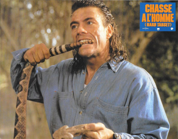 Prenant place dans les bas-fonds de la Nouvelle Orléans, présentée comme une ville sans loi où la vie ne vaut pas grand-chose, Chasse à l’homme met donc en scène Jean-Claude Van Damme dans la peau d’une espèce de cowboy urbain, arborant coupe mulet et cheveux gras. Il se voit confronté deux méchants mémorables, incarnés par Lance Henriksen et Arnold Vosloo. Le personnage interprété par Vosloo se nomme d’ailleurs Van Cleaf, si vous n’aviez pas encore capté qu’on était en plein western. Et comme le dit l’adage populaire, « Un bon western repose en partie sur un bon méchant ». Le film témoigne dès lors presque naturellement d’une admiration certaine de John Woo pour ses deux méchants, et en particulier pour Lance Henriksen, qui s’avère vraiment extraordinaire dans ce rôle basé sur tous les excès. L’acteur se régale manifestement à en faire des caisses dans la peau de cette ordure machiavélique, développant une aura presque démoniaque durant les dernières séquences du film. Pas subtil pour deux sous, Chasse à l’homme n’évite d’ailleurs pas les clichés les plus éculés des années 90 concernant ce personnage, censé représenter toute la décadence de la société occidentale : il est ainsi présenté un aristocrate oisif, immensément riche, français (son nom est Fouchon) et supposément homosexuel (sa relation avec Van Cleaf est teintée de trouble).
