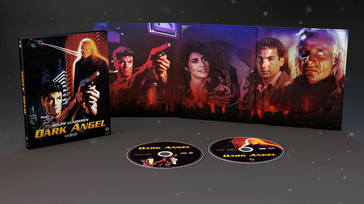 Dark Angel arrive donc en France sur support Haute-Définition ce mois-ci, sous les couleurs de MDC Films, nouvel éditeur qui nous propose de découvrir le film dans un écrin assez remarquable : les galettes sont installées sur un Digipack trois volets aux couleurs du film, le tout étant surmonté d’un fourreau. La maquette et la composition graphique du boitier sont signées par Fred Domont, le talentueux graphiste du Chat qui fume. On n’a pas reçu le Combo Blu-ray + DVD finalisé de Dark Angel, mais la qualité des finitions de celui d’Exterminator 2 nous permet d’affirmer qu’un grand soin a été apporté par l’éditeur au fait de nous proposer une édition s’imposant d’entrée de jeu comme un bel objet et une édition de référence, que l’on sera fier de voir trôner sur son étagère aux côtés d’autres classiques des années 80.