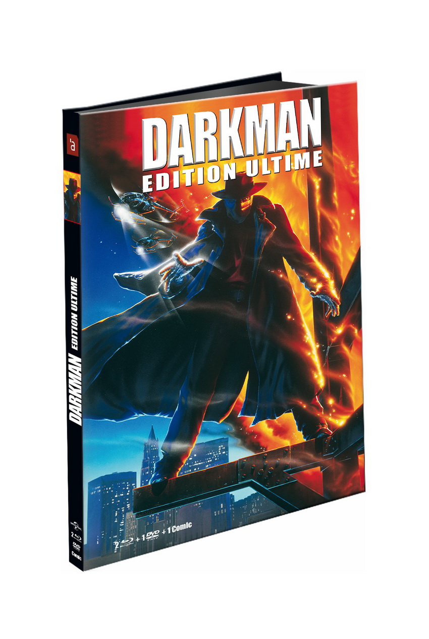 Née de la passion des équipes éditoriales de L’atelier d’images, et avec le support de nombreux internautes suite à une campagne de crowdfunding, Darkman débarque donc ce mois-ci dans une édition « ULTIME » qui n’a pas volé son appellation. Deux Blu-ray, un DVD, le tout étant présenté sous la forme d’un comic-book hardcover à la couverture glacée et aux imposantes dimensions de 26 sur 17 centimètres : ce Darkman – Édition ultime s’impose d’entrée de jeu comme un magnifique objet de collection. Cette édition bénéficie également d’un tirage « limité » à 4200 exemplaires numérotés – ce qui pourra certes paraître étrange quand on connaît le marché du Blu-ray en France, comportant bien des galettes ne s’écoulant, malgré leur qualité, qu’à quelques centaines d’exemplaires dans l’hexagone.