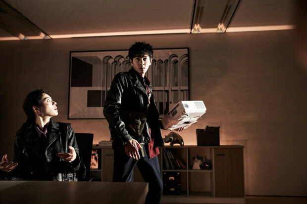 Dans Escape from the 21st Century, le trio de personnages principaux découvre un 2019 dystopique, saturé de corruption, de violence et de versions futures d’eux-mêmes qui n’ont pas vraiment tourné comme prévu. Le film exploite cette confrontation avec une énergie presque punk, où chaque scène semble vouloir exploser hors du cadre. L’esthétique du film, très particulière, repose sur un mélange de couleurs saturées, de transitions frénétiques et d’effets visuels qui semblent sortir d’un jeu vidéo sous amphétamines. Le film multiplie les ruptures de rythme, les changements d’aspect ratio, les incrustations animées, comme si l’écran lui-même avait décidé de faire un burn-out.