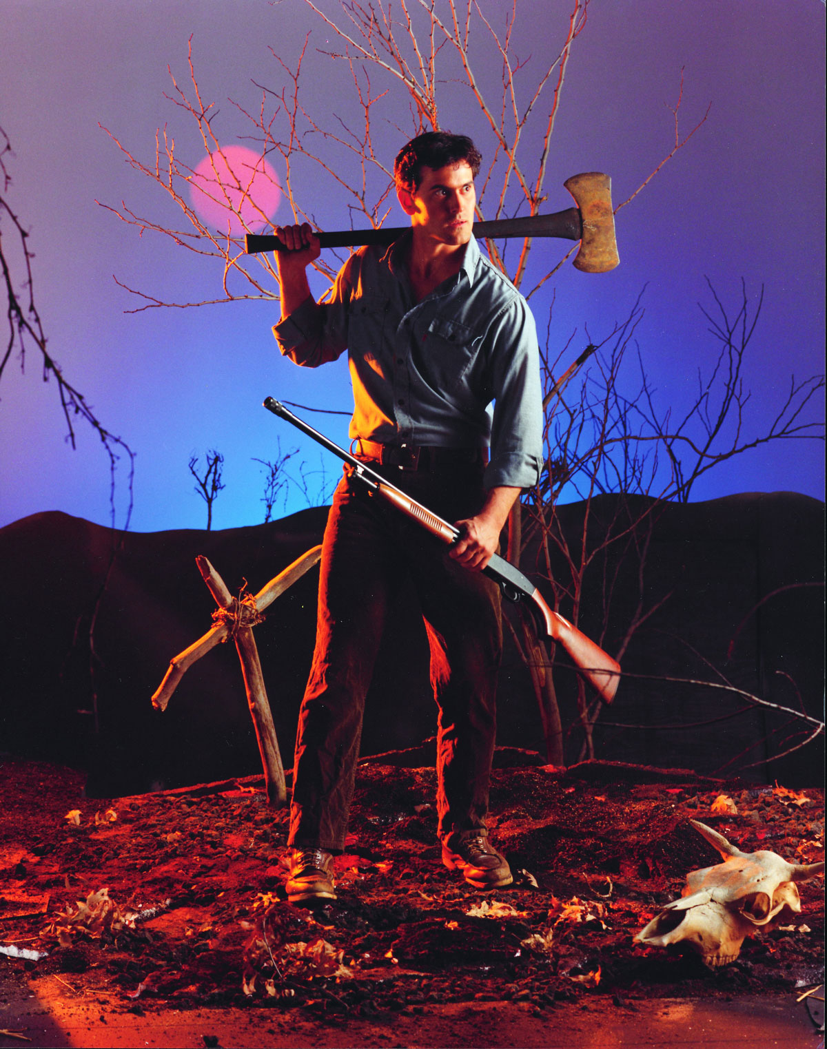 Étant donné que le troisième épisode de la saga ne pouvait pas suivre la même logique que le deuxième opus, Sam Raimi y prend le parti d’élargir la « mythologie » autour du personnage central et du Necronomicon, le fameux livre des morts. Et à n’en point douter, la grande réussite d’Evil dead III : L’armée des ténèbres réside avant tout dans le personnage – devenu culte – d’Ash Willliams. Ne nous voilons pas la face : si on aime tant ce film, ce n’est pas [seulement] grâce à ses qualités cinématographiques, à son rythme et à son humour, mais [aussi et surtout] grâce à se personnage génial, cartoonesque en diable, veule, malchanceux, prétentieux, de mauvaise foi, égoïste, menteur, souvent imbécile et franchement maladroit. L’excellent Bruce Campbell s’en donne donc à nouveau à cœur joie dans la peau de Ash, avec un cabotinage aussi outrancier que désopilant. Un cabotinage d’ailleurs d’autant plus accentué que l’acteur incarne plusieurs rôles avec le même enthousiasme (communicatif), et qu’il est très bien servi par un script malin et beaucoup plus fouillé que les précédents, lui laissant largement, et à de nombreuses reprises, tout le loisir de laisser vagabonder sa fantaisie : punchlines destructrices, cadrages iconiques über-cool, nombreux passages ouvertement comiques…