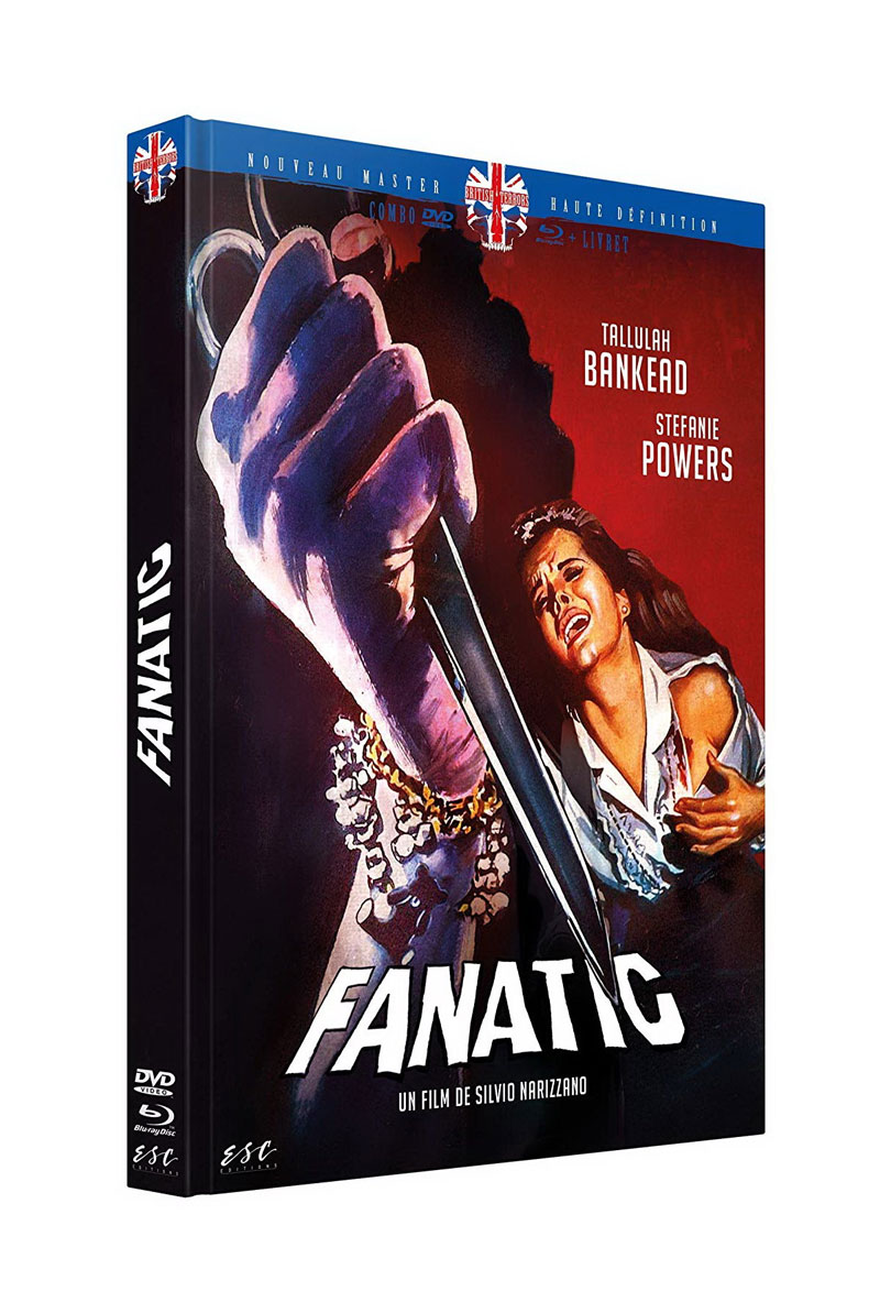 Disponible depuis quelques années en Blu-ray aux États-Unis dans une édition couplée avec Maniac (1963), Fanatic débarque aujourd’hui en France sur support Haute Définition, sous les couleurs de ESC Éditions. Il intègre donc fort logiquement la collection « British Terrors », dont il constitue le douzième titre. La bonne nouvelle bien sûr, c’est que le film de Silvio Narizzano – comme les autres de la collection – arrive dans les rayonnages de vos revendeurs préférés au sein d’un très beau coffret, prenant la forme d’un « médiabook » d’aspect luxueux et proposant en plus du film sur support DVD et Blu-ray un livret de 16 pages signé Marc Toullec et intégré à l’étui ; l’éditeur ne nous ayant fourni ni de copie du livret ni d’exemplaire finalisé de la « bête », on ne pourra pas s’exprimer sur leur qualité, mais on fait aveuglément confiance à ESC Éditions.