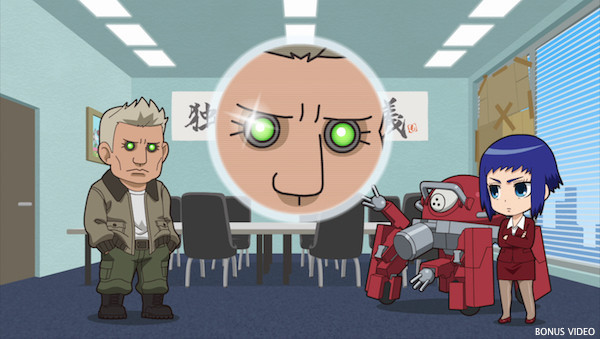 Côté suppléments, l’éditeur nous propose une série de bonus très originaux et pour tout dire assez indispensables. Si rien n’a de lien précis avec le film à proprement parler, il s’agit d’une série de courts-métrages proposant une exploration assez inédite de l’univers Ghost in the shell, dans le sens où tous prennent des directions narratives inattendues et improbables. On commencera donc avec une série de 14 courts-métrages humoristiques. Les quatre premiers, issus de la série Logicoma BEAT Lyrics of Logistics Conveyer Machine, mettent en scène des « Logicoma » (les fameux engins de transport ayant la faculté de se rendre invisibles) en leur prêtant des sentiments et discussions absurdes et assez hilarantes. Le tout est de plus visuellement assez sublime. Les dix courts-métrages suivants sont des épisodes d’une série intitulée Unit.9 / President Kusanagi and Secretary Logicoma and Performance Evaluation, et mettent en scène des entretiens d’embauche au sein de la Section 9. Enthousiasmants et souvent bien barrés, ces petits dessins animés vous mettront forcément le sourire aux lèvres si vous aimez l’œuvre de Shirow. Enfin, on trouvera également ARISE border:less project, une série de cinq courts-métrages (quatre « live » et un animé) issus de l’imagination de réalisateurs d’horizons très différents. On passera donc du délire conceptuel aux petites histoires, de la poésie à la SF, le tout dégageant malgré l’hétérogénéité de l’ensemble une ambiance étrange et assez passionnante.