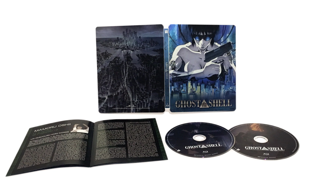 Mais ce n’est pas tout : comme vous le savez sans doute, @Anime fait partie de ces (trop rares) éditeurs qui n’oublient jamais qu’une édition collector qui se respecte se doit AUSSI d’être un bel objet. Cette riche édition contenant deux Blu-ray se présente donc dans un très classieux Steelbook aux couleurs du major Kusanagi, reprenant le superbe visuel de l’affiche de 1995. En plus des deux galettes, cette édition comprend également un livret de 20 pages contenant une biographie et une interview de Mamoru Oshii, la retranscription d’une discussion entre Kenji Kawai et Oshii, ainsi que quelques extraits du storyboard. Et comme si cela ne suffisait pas, l’édition spéciale FNAC, uniquement disponible dans cette chaine de magasins, comporte aussi le CD de la bande-originale, presque aussi indispensable que le film lui-même ! Un boulot éditorial au top pour une édition en tous points remarquable.