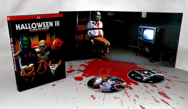 Côté technique, Le chat qui fume nous délivre, comme à son habitude, un sans-faute absolu avec cette édition Blu-ray d’Halloween III – Le sang du sorcier : définition précise, couleurs littéralement explosives, piqué à tomber, master full HD 1080p, aucun souci d’encodage à déplorer. Le rendu HD est sublime, et les amoureux de cette curiosité des années 80 (et il y en a plus qu’on ne le croit !) seront absolument ravis de redécouvrir le film dans des conditions inédites et absolument superbes : on tire à nouveau notre chapeau à l’éditeur pour cette merveilleuse présentation, d’autant que la rugueuse patine argentique d’origine a été respectée aux petits oignons frits sauce samouraï avec un supplément pickles. Côté son, le spectacle acoustique est également d’un excellent niveau : le film de Tommy Lee Wallace est proposé dans un mixage DTS-HD Master Audio 2.0 en VO anglaise comme en VF d’époque, fidèle aux intentions d’origine des auteurs du film, le tout étant disponibles avec des sous-titres français clairs et sans fautes. Le film est également disponible dans un remixage DTS-HD Master Audio 5.1, essentiellement frontal durant les scènes dialoguées (ce qui préserve bien heureusement l’esprit du film), mais proposant une très intéressante et efficace spatialisation de la musique du duo John Carpenter / Alan Howarth et des effets d’ambiance. Bref, on peut y aller les yeux fermés, cette présentation acoustique s’avérant à la fois respectueuse et suffisamment spectaculaire pour tenter l’aventure.