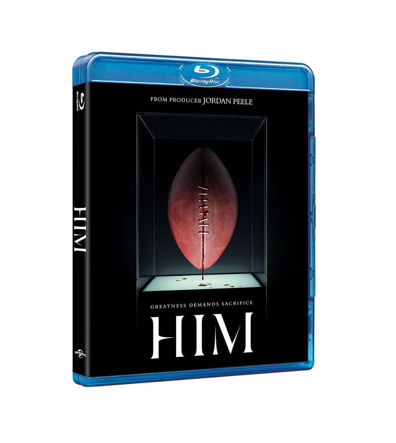 Le Blu-ray de Him, édité par Universal Pictures, arrive dans un packaging sobre mais élégant, avec une illustration de jaquette qui capture parfaitement l’atmosphère trouble du film. Le visuel du ballon de foot ensanglanté sur fond noir est tout à fait pertinent, dans le sens où il met en avant le contraste entre la lumière des stades et l’ombre des traumatismes : un choix esthétique qui reflète bien toute l’ambivalence du film. Techniquement, l’image du Blu-ray nous offre une précision remarquable : les textures de peau, les détails des équipements sportifs, les variations de lumière dans les scènes désertiques, tout apparaît avec une netteté presque clinique. Les séquences sombres, nombreuses, bénéficient de noirs profonds, même si un léger écrasement peut parfois se faire sentir. Les couleurs, volontairement désaturées, conservent leur cohérence, et le grain ajouté lors de l’étalonnage donne à Him une texture organique qui renforce son atmosphère oppressante. Côté son, le Blu-ray nous propose une VO en Dolby Atmos et une VF en Dolby Digital+ 7.1, toutes deux très solides. La version originale déploie une spatialisation impressionnante, notamment lors des scènes de stade ou des moments de tension où les bruits sourds et les respirations amplifiées envahissent l’espace sonore. La version française, de son côté, offre une clarté remarquable, avec des dialogues nets et une dynamique bien équilibrée. Les deux pistes permettent de profiter pleinement de la bande-son, qui oscille entre chœurs inquiétants, percussions lourdes et silences oppressants. Him gagne beaucoup à être écouté FORT, tant le son participe à son identité et à son atmosphère.