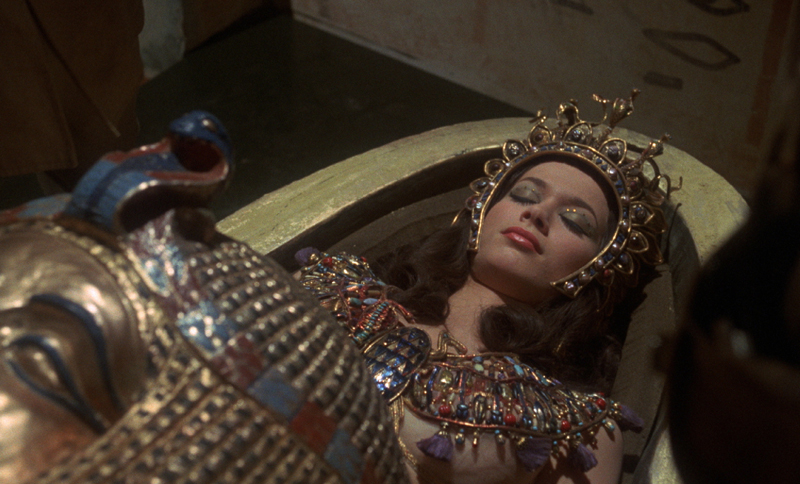On continuera avec une intéressante featurette intitulée « La malédiction du pharaon » (19 minutes), qui reviendra sur l’histoire de la production du film, rythmée par des entretiens avec les historiens du cinéma Kevin Lyons, John J. Johnston, Alan Barnes et Jonathan Rigby. Ils y reviendront sur les drames survenus durant la production du film, mais s’attarderont en revanche d’avantage sur ses qualités. L’actrice Valerie Leon sera également de la partie, se remémorant le tournage du film presque 50 ans après sa sortie. Tous les intervenants salueront d’ailleurs sa prestation, Jonathan Rigby soulignant que Leon avait tourné dans la « Sainte Trinité » du cinéma britannique, en jouant tout à la fois pour la Hammer, en devenant James Bond girl et en interprétant plusieurs rôles dans la série de films Carry on, quasiment inconnue en France mais comptant tout de même une trentaine de long-métrages tournés entre 1958 et 1992.