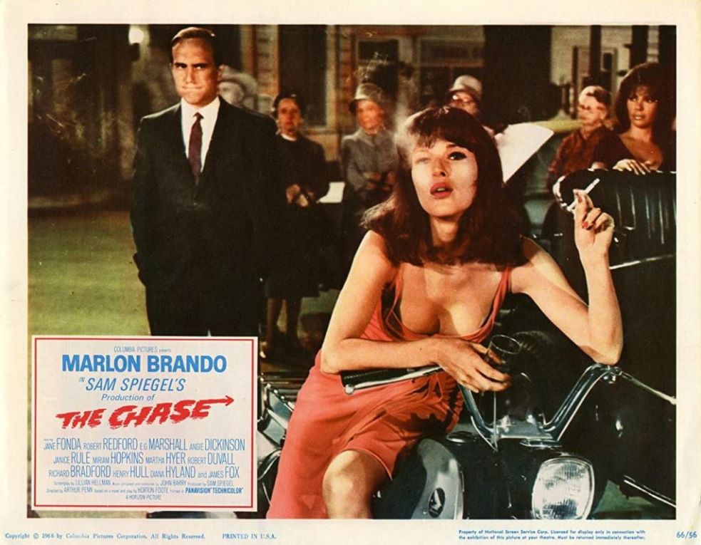 Aux côtés de Marlon Brando et Robert Redford, tous deux remarquables de retenue, on trouvera également Robert Duvall dans une de ses premières apparitions à l’écran. Et si le petit gars à lunettes jouant de la guitare vous dit quelques-chose, c’est normal, il s’agit de Paul Williams, auteur compositeur interprète, occasionnellement acteur, internationalement connu pour avoir incarné le personnage de Swan dans l’extraordinaire Phantom of the Paradise (Brian De Palma, 1974). Du côté des actrices, si ce sont Angie Dickinson et Jane Fonda qui crèvent l’écran, impossible de ne pas remarquer Janice Rule dans le rôle de la femme infidèle de Robert Duvall, provocatrice en diable. On notera également la présence à l’écran de Katherine Walsh, actrice très prometteuse qui incarnait ici la jeune Verna (la blonde avec le bandeau dans les cheveux). Après La poursuite impitoyable en 1966, on la remarquerait également dans The trip de Roger Corman l’année suivante. Ces deux films sont les seuls dans lesquels on a pu la voir – on la retrouverait en effet morte dans son appartement de Kensington en 1970. Les circonstances de son décès sont floues, le rapport du coroner concluait que sa mort était due à une intoxication alcoolique et barbiturique, sans qu’il ait été possible de déterminer s’il s’agissait d’un suicide, d’un accident ou même d’un meurtre, comme on l’a soupçonné à l’époque.