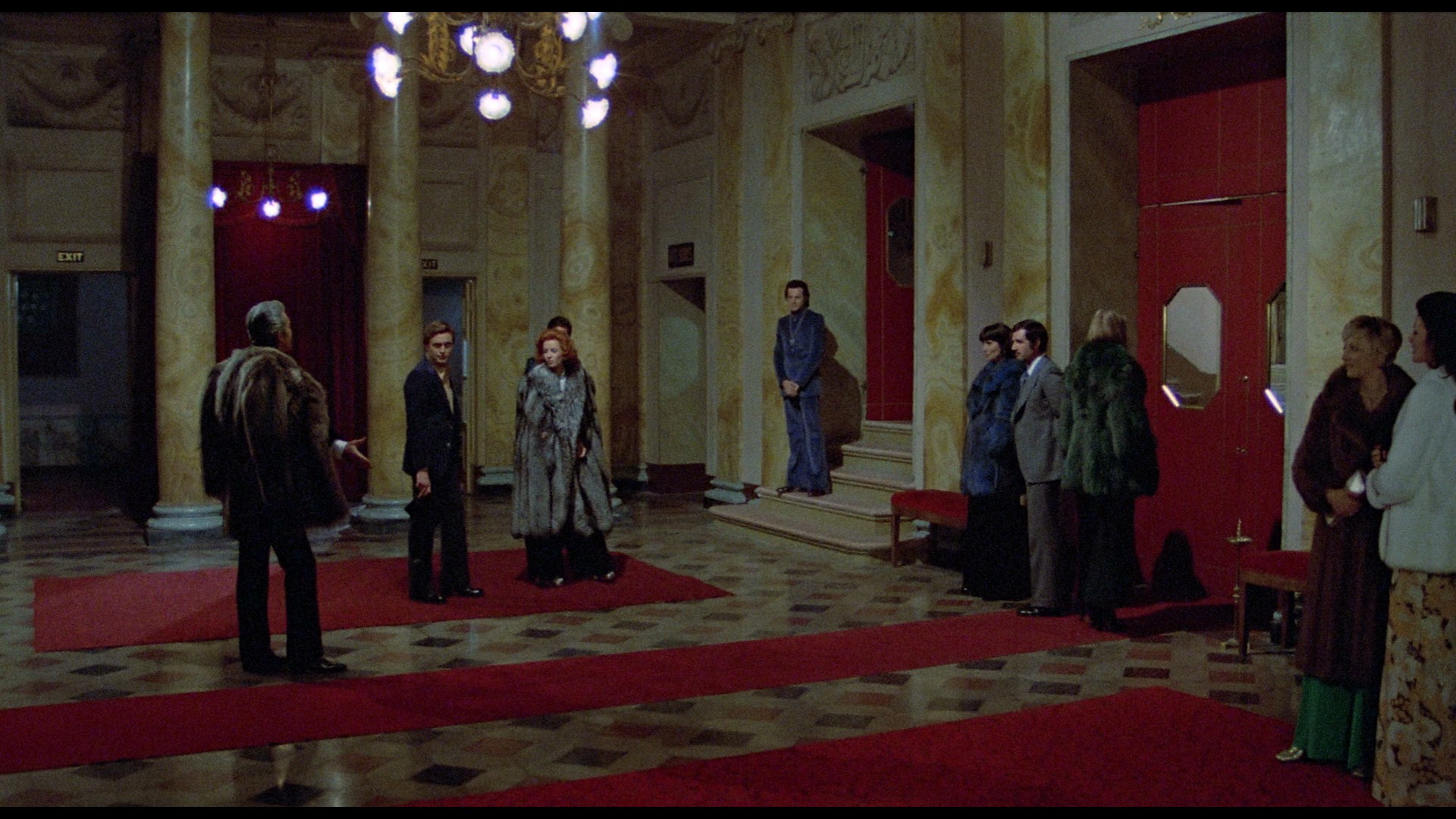Par bien des aspects donc, L’assassin a réservé neuf fauteuils s’apparente au giallo tout ce qu’il y a de plus classique. Pour commencer, on sera bien en présence, durant un premier temps du moins, des fétichismes visuels habituels du genre : caméra subjective, gants de cuir noirs, présence d’arme blanche… Se déroulant en huis clos dans l’enceinte d’un superbe théâtre italien, dont on ne bougera pas du début à la fin du film, la trame évoque évidemment les énigmes imaginées par Agatha Christie (et « Dix petits nègres » en particulier). Le film de Giuseppe Bennati enchaine les meurtres avec habileté, l’identité du tueur est des plus mystérieuses, les soupçons pèsent sur tous les protagonistes : cela pourrait être n’importe qui… La forme du whodunit semble donc à priori respectée, et le tout est agrémenté d’un soupçon d’érotisme et d’un certain sadisme dans les mises à mort. On navigue donc en terrain connu, d’autant que comme dans tout bon giallo qui se respecte, le scénario tend vers un aspect un peu réactionnaire, propre à la société italienne des années 70, encore fortement emprunte de valeurs catholiques. Ainsi, les personnages du film, si nombreux soient-ils, sont tous d’infects et arrogants représentants de la bourgeoisie italienne. Non seulement ils sont riches, mais cumulent en plus de cela toutes les déviances possibles : mensonges, activités financières louches, tromperies, homosexualité, amour libre, drogue… La décadence de la bourgeoisie dans toute sa grandeur !