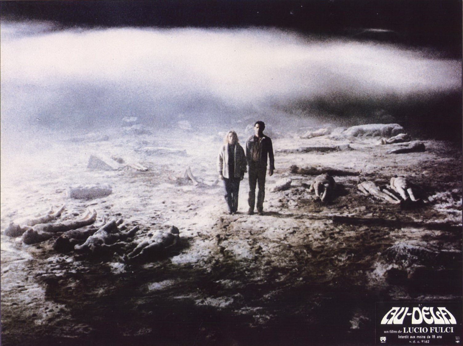 Pour autant, et même au sein de ce quatuor zombiesque, L’au-delà a toujours été unanimement reconnu comme l’un des plus grands chefs d’œuvre de la carrière de Lucio Fulci. Déjà parce qu’il constitue sans conteste un des sommets plastiques de sa filmographie : l’habile composition des plans, la sublime photo signée Sergio Salvati, tout concourt à faire du film une expérience visuelle assez époustouflante. Mais si le film sort un peu du lot par rapport aux autres films de Fulci, c’est aussi et peut-être surtout parce que L’au-delà s’impose rapidement comme un film d’ambiance, développant une atmosphère si étrange et une narration si bizarrement « flottante » que les défauts de certains de ses films précédents en prennent ici des allures de qualités, dans le sens où ils renforcent encore l’atmosphère cauchemardesque et macabre de l’ensemble. Ainsi, plusieurs séquences du film s’avèrent particulièrement inutiles, incompréhensibles,voire même incohérentes : la visite de la femme du plombier à la morgue, les recherches du journaliste au cadastre… Fulci casse la linéarité de l’intrigue, propose des digressions oniriques semblant dénoter d’une volonté farouche de déstabiliser le spectateur, de le priver du confort de ses repères rationnels. Ainsi, L’au-delà nous propose au final de suivre une poignée de personnages dans leurs errements au cœur d’une intrigue dont la temporalité semble dilatée ; curieusement et presque contre toute attente, la magie opère, nous livrant sur celluloïd l’expression la plus pure et la plus exacerbée de la sensibilité artistique, à la fois macabre et poétique, de Fulci.