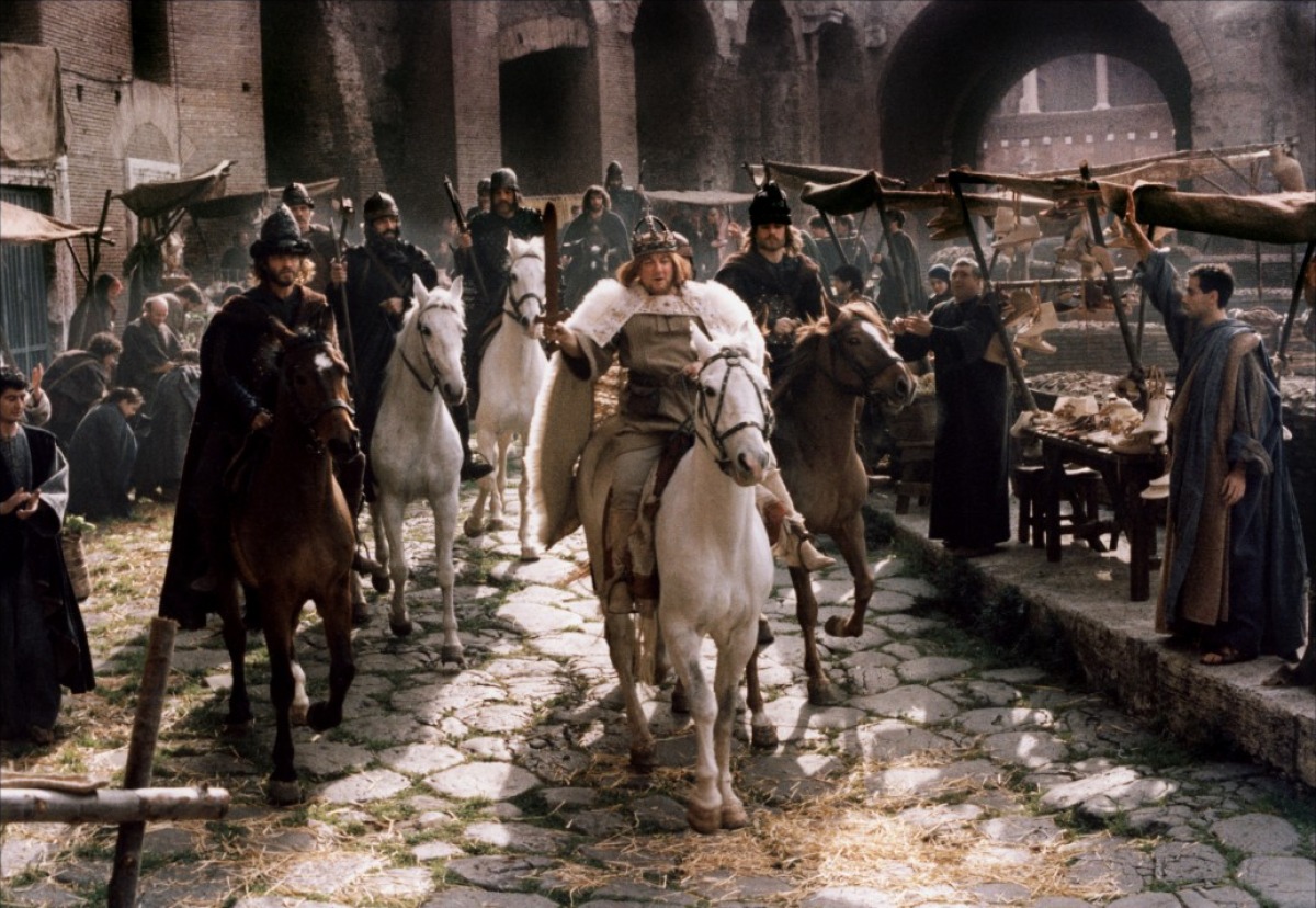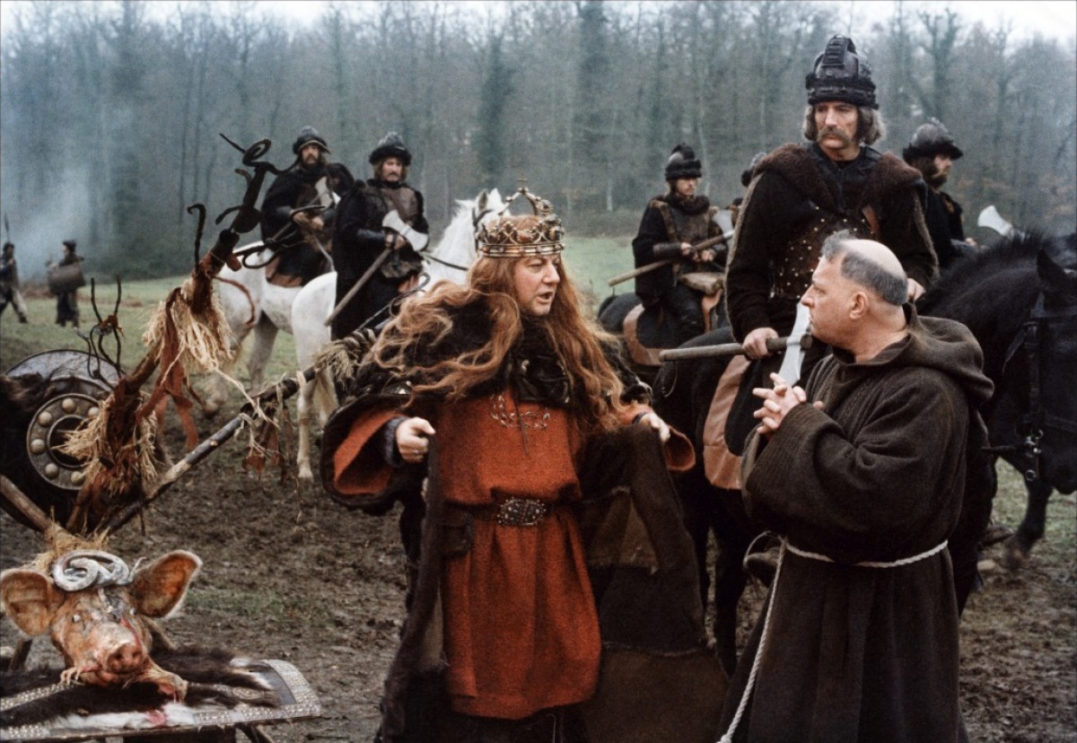 Si à la base, le scénario du Bon roi Dagobert signé Gérard Brach était, parait-il, un modèle de rigueur historique, le film de Dino Risi sorti sur les écrans français durant l’été 1984 ne rend pas forcément justice aux recherches méticuleuses menées par le scénariste sur les Rois Fainéants et leur époque. Le film s’avère en effet littéralement « vampirisé » par la personnalité de Coluche, qui signe ici le portrait d’un roi pleutre et assez répugnant ; le franc-parler qu’il utilise, principalement au détour de deux/trois monologues riches en savoureuses saillies anticléricales, respire la bonne vieille « sagesse populaire » – euphémisme généralement d’usage quand on évoque ce bon vieux populisme des familles. Ainsi, de la rigueur historique du script d’origine, Risi ne retiendra au final que les aspects les plus obscènes et peu ragoutants.