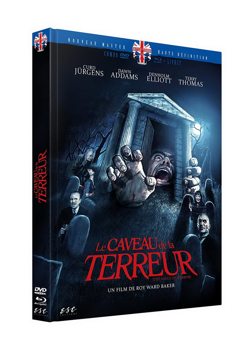 Disponible chez ESC Éditions dans sa collection « British Terrors », Le caveau de la terreur s’affiche dans un superbe Combo Blu-ray + DVD + Livret de 16 pages prouvant une fois de plus que l’éditeur français est bien déterminé afin de fournir au consommateur des éditions qui soient également de « beaux objets » de collection. Aussi bien côté image que côté son, le master proposé par l’éditeur est de bonne tenue ; le film est proposé au format 1.85:1 respecté et encodé en 1080p. Le piqué est d’une belle précision, le grain cinéma est parfaitement préservé, et couleurs et contrastes semblent avoir été tout particulièrement soignés, même si les noirs apparaissent comme un poil bouchés sur quelques plans épars. L’ensemble est donc chaudement recommandé ! Rien à redire non plus sur le mixage audio, proposé en DTS-HD Master Audio 1.0 mono d’origine, clair et sans souffle en VO, un peu plus problématique sur la VF, même si on s’en contentera parfaitement étant donné la rareté du film, qui demeurait de plus à ce jour complètement inédit en France en DVD.