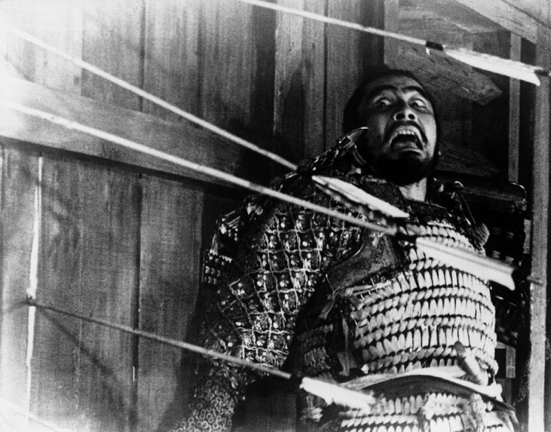 A cet ascétisme formel et aux codes du théâtre Nô, exigeant des acteurs qu’ils se déplacent peu et compriment leurs énergies, s’oppose donc l’emphase du récit de Shakespeare, conte de la folie et de la soif de pouvoir mortifère. Et pourtant, Le château de l’araignée fonctionne à plein régime, à travers les expressions des acteurs, qui correspondent à quelques-uns des 138 masques stylisés du Nô, et notamment grâce au jeu enfiévré de Toshiro Mifune (dont le regard enragé reste d’une impressionnante intensité, même quand il se situe à l’arrière-plan) et d’Isuzu Yamada, à qui Kurosawa confie une présence spectrale plaçant souvent le film aux limites du fantastique.