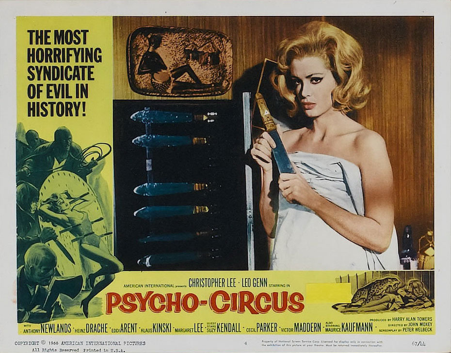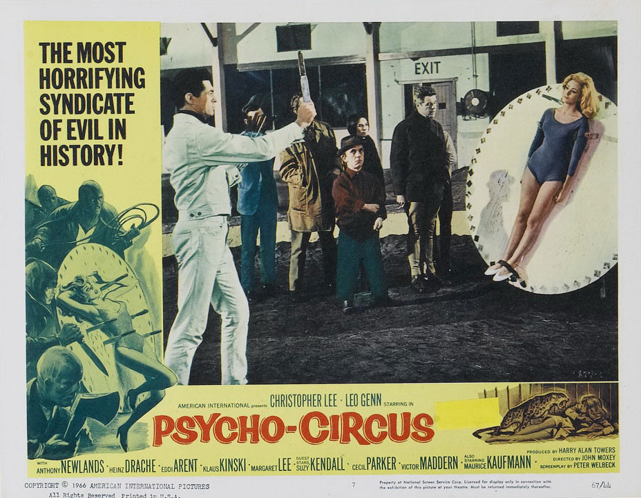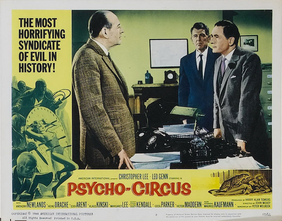 Pour les différencier cependant, rien de plus simple : Le cirque de la peur met en scène Christopher Lee (c’est déjà un sacré bon point) et surtout, il s’agit d’une adaptation d’Edgar Wallace. Auteur au rythme de travail impressionnant, il publiera entre 1905 et 1932 plus de 170 romans policiers et récits d’aventures. Perclus de dettes à sa mort en 1932, son œuvre connaîtra un vif regain d’intérêt au début des années 60, avec la production au Royaume-Uni des Edgar Wallace Mysteries (1960-1965), série de 47 films de série B destinés à être projetés en deuxième partie d’un double-programme, puis avec une vague de « Krimis », films policiers en provenance d’Allemagne, produits par le studio Rialto : 32 films adaptés des œuvres d’Edgar Wallace seront donc réalisés en Allemagne entre 1960 et 1972. Sorti au Royaume-Uni en 1966, Le cirque de la peur débarquait de fait en pleine Wallace-Mania ; très représentatif du style narratif d’Edgar Wallace, le film impose sans peine son récit classique en forme de « whodunit », avec sa galerie de personnages troubles, semblant tous avoir quelque chose à cacher, autour de laquelle gravite l’inspecteur Elliott (Leo Genn), aussi flegmatique que perspicace. Bien sûr, le scénario signé Harry Alan Towers (la série des Fu-Manchu avec Christopher Lee) a tendance à en rajouter un peu dans le côté louche de certains des personnages du film : on pense par exemple à celui incarné par Klaus Kinski qui, à la recherche de son complice de braquage disparu, cherche à se faire embaucher par le patron du cirque, tout en refusant obstinément de donner son nom…