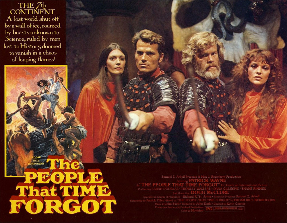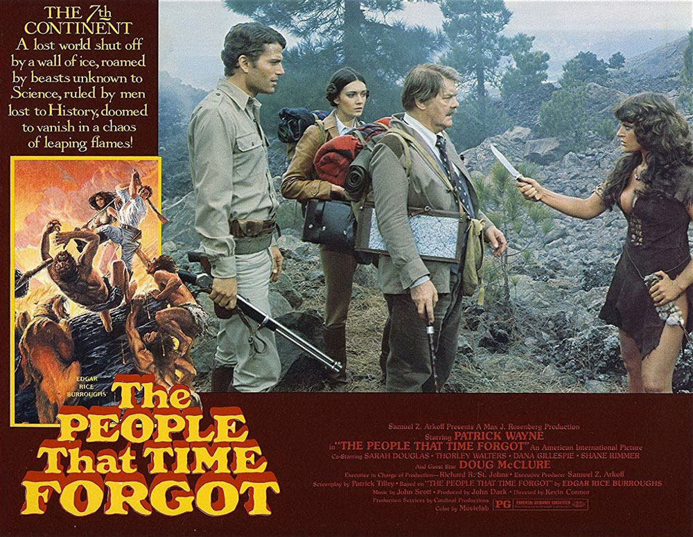 Même s’il peut sans le moindre problème être découvert de façon indépendante, Le continent oublié (1977) est en réalité la suite du Sixième continent (1974) ; le film met donc en scène une opération de sauvetage menée par le fringant Ben McBride (Patrick Wayne), et destinée à secourir Bowen Tyler, le personnage central du film précédent, incarné à l’écran par Doug McClure. La filiation entre les deux films est d’ailleurs un peu plus claire en VO : le premier film s’appelait The land that time forgot, le second The people that time forgot. On pourra également intégrer ces deux films au sein d’une tétralogie consacrée par le réalisateur Kevin Connor à quatre des « Mondes perdus » imaginés par Edgar Rice Burroughs au début du vingtième siècle. Les amateurs d’aventures exotiques et d’explorateurs/trices confrontés à des dinosaures ou à des civilisations disparues pourront donc également se tourner vers Centre Terre, septième continent (1976) et Les sept cités d’Atlantis (1978). Mais pour l’heure, revenons au Continent oublié.