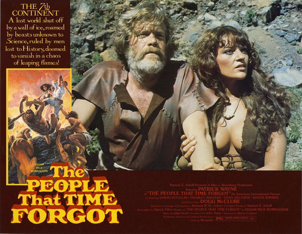 Le continent oublié est le seul des quatre films de Kevin Connor adaptés de Burroughs dont le héros n’est pas Doug McClure : il n’apparaîtra ici que dans le dernier tiers du film, et durant une longue scène d’évasion / éruption de volcan qui occupera une large portion du métrage. Comme on l’a dit plus haut, le héros de celui-ci est incarné par Patrick Wayne, mais on retiendra surtout du film les deux personnages de femmes que tout oppose : d’un côté on aura donc Sarah Douglas, qui incarne une femme libre et émancipée, maniant aussi bien les armes que le verbe, comme le prouve une poignée de punchlines assassines adressées aux hommes qui l’entourent. De l’autre côté, on trouvera Dana Gillespie, qui incarne au contraire la femme « objet » du film, quasi-muette et arborant un décolleté tellement audacieux que les producteurs craignirent qu’il ne leur pose des problèmes vis à vis de la censure. Dana Gillespie s’était d’ailleurs faite connaître en tenant un rôle similaire environ dix ans plus tôt dans la formidable série B de la Hammer intitulée Le peuple des abîmes (1968). Mais que les producteurs du Continent oublié n’aient pas fait preuve d’une grande imagination dans le choix des acteurs révèle en fait surtout le côté vraiment « anachronique » du film de Kevin Connor, qu’on imaginerait plutôt avoir été réalisé dix, voire même vingt ans plus tôt. Difficile d’imaginer en effet qu’ait pu voir le jour en 1977 un film aussi kitsch, proposant des effets spéciaux d’un autre âge, surimpressions surannées, matte paintings exagérément visibles, dinosaures en carton-pâte ou prenant la forme de marionnettes… Difficile à croire quand on pense qu’en 1976 sortait le King Kong de John Guillermin, et qu’en 1977, soit la même année que Le continent oublié sortaient des films tels que La guerre des étoiles ou Rencontres du 3ème type…