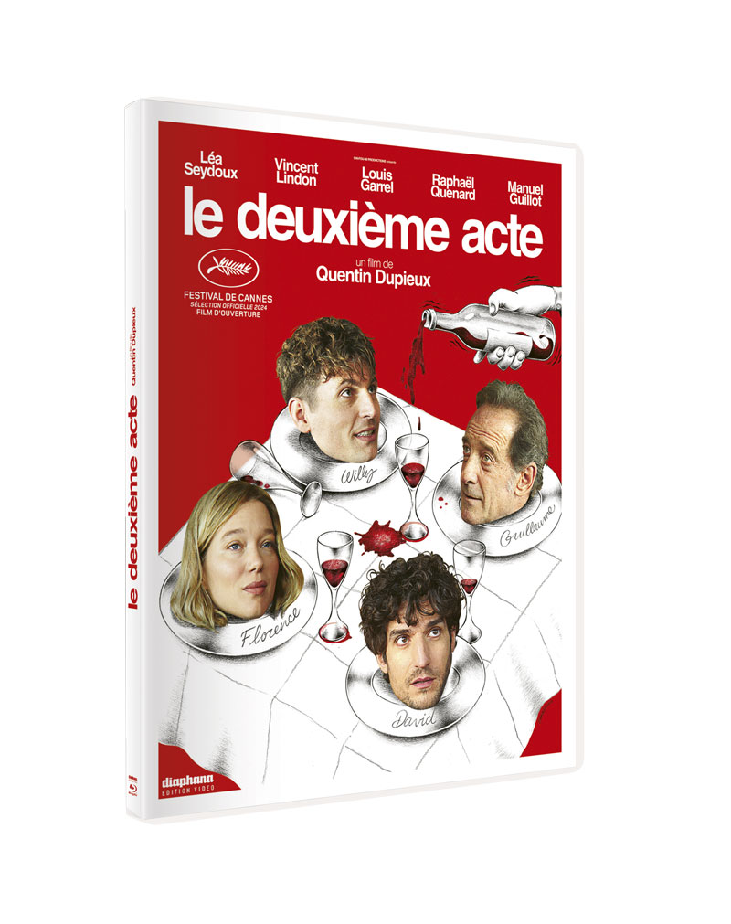 Le Deuxième acte vient tout juste de sortir au format Blu-ray, sous les couleurs de Diaphana. Techniquement très soignée, la galette Haute-Définition rend un joli hommage au petit film de Quentin Dupieux, tout autant qu’à la jolie photo du film, également signée Quentin Dupieux, au même titre que le montage. La définition est au taquet, le piqué précis, les couleurs naturelles et les noirs admirablement denses et profonds. Le film est naturellement proposé au format et en 1080p, bref c’est du tout bon, on peut applaudir des deux mains l’éditeur. Côté son, le film nous est proposé dans un mixage DTS-HD Master Audio 5.1, et se révèle dynamique pile-poil comme il le faut : la scène arrière assure la restitution des ambiances et permet vraiment une immersion parfaite. Les dialogues sont toujours parfaitement clairs, et ce même lorsque plusieurs personnes s’expriment en même temps. Un mixage DTS-HD Master Audio 2.0 est également disponible, et s’avérera sans doute plus cohérent si vous visionnez Le Deuxième acte sur un simple téléviseur, sans barre de son ou système de Home Cinema.