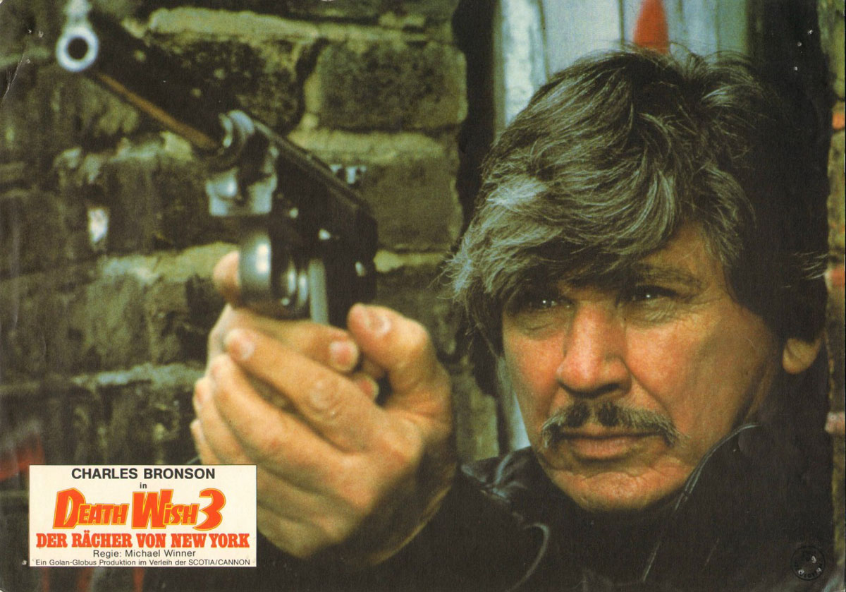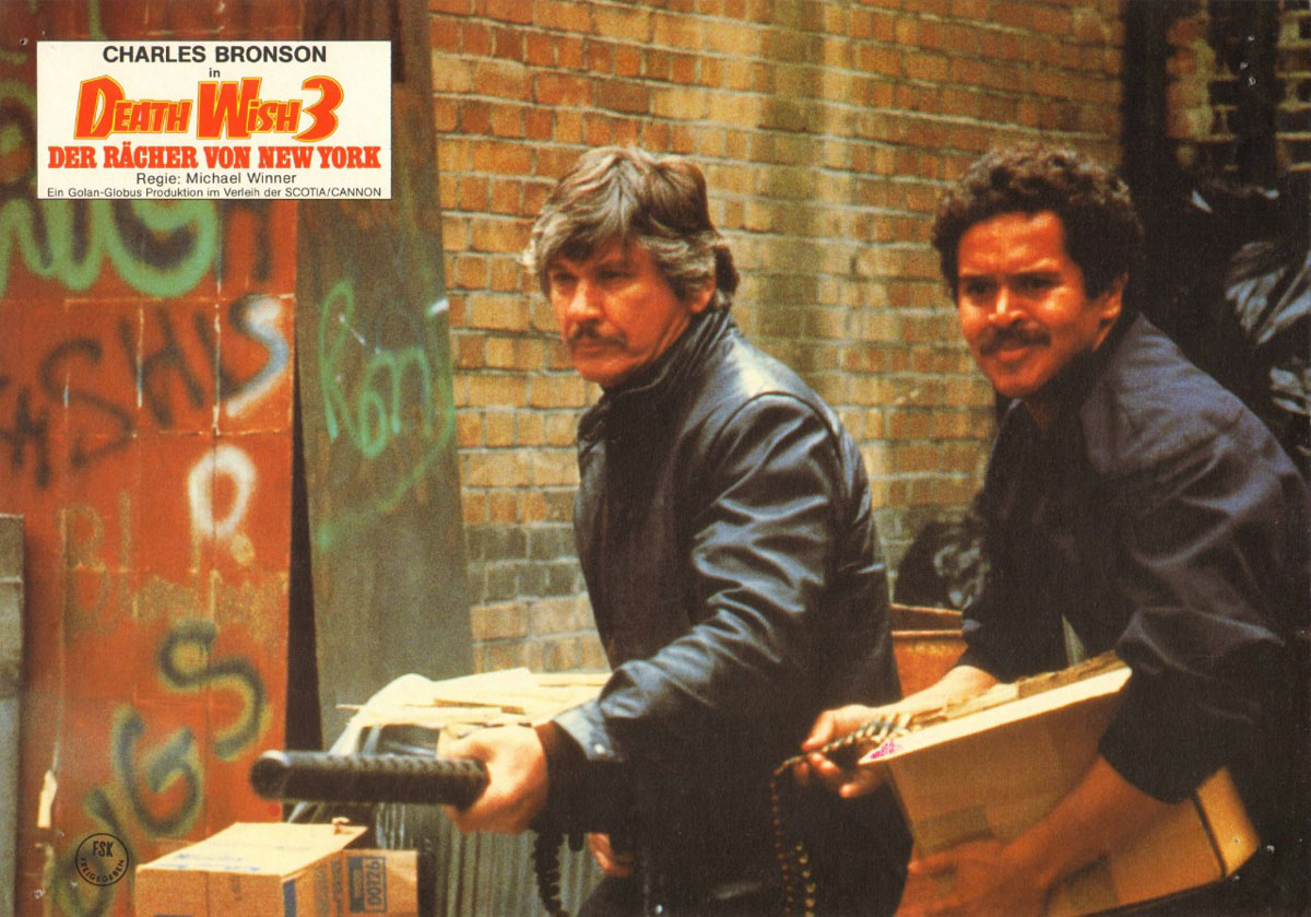 Outrancier et tellement hénaurme que l’on se demande bien comment quiconque a pu un jour le prendre au sérieux, Le justicier de New York permet à Michael Winner de laisser libre cours à son don pour l’exagération. Une exagération décomplexée qu’on retrouve à tous les niveaux du film : ainsi, le film prend notamment place dans une ville dévastée, un no man’s land où les gangs font régner la terreur. L’idée directrice semble avoir été de présenter New York au spectateur à la façon de films post-nuke tels que Les guerriers du Bronx (1982) et Les guerriers du Bronx 2 (1983), tous deux signés Enzo G. Castellari. Terrains vagues dévastés, bandes de motards dégénérés et gangs punkoïdes à la Mad Max 2, on nage en pleine SF post-nuke. Winner pousse tellement le bouchon qu’il semble envoyer aux chiottes les nobles idées de justice ou d’honneur : en guise de riposte graduée, on passe directement du cran d’arrêt au lance-roquettes, et les « bonnes gens » d’applaudir à tout rompre quand Bronson flingue du loubard. Que cela soit quand il bute un mec en lui tirant une bastos dans le dos ou dans une optique de massacre de masse comme à la fin du film.