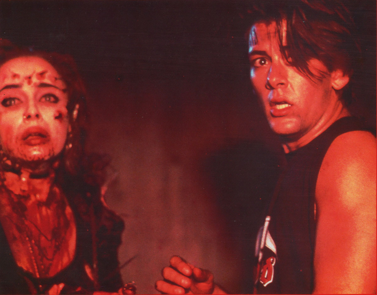 Ce sous-texte mélodramatique, qui dénote d’une tonalité ouvertement passionnée et romantique malgré le côté très rock n’ roll de notre couple de jeunes gens, est au centre du Retour des morts vivants 3. Bien sûr, l’idée de génie de Brian Yuzna – qui sera reprise de nombreuses fois par la suite, dans des films tels que Zombie lover (2009), Warm bodies (2013) ou encore Life after Beth (2014) – est de mettre en parallèle cette idée héritée de La fiancée de Frankenstein avec une intrigue secondaire absolument troublante, suivant les tentatives répétées de Julie afin de se mutiler, de se percer, de se piquer, s’arracher ou se couper la peau dans le but de calmer la faim insatiable de chair humaine qui la tenaille. Ces séquences, qui ont largement contribué à la célébrité ainsi qu’à la pérennité du film de Yuzna, bénéficient de tout le talent des artistes en effets spéciaux que sont Chris Nelson et Steve Johnson, et du choix de l’actrice Mindy Clarke, dont le visage oblong et le front proéminent ont probablement permis aux deux experts de laisser libre cours à leur imagination macabre de façon à proposer le maquillage le plus efficace et le plus spectaculaire qui soit.