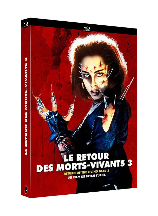 C’est bien sûr à nouveau Le chat qui fume que l’on retrouve derrière cette belle édition Combo Blu-ray + DVD du Retour des morts vivants 3, qui débarque chez nous rien de moins que 18 ans après une première édition DVD qui naturellement avait bien besoin d’un petit rafraîchissement technique. Et à ceux qui ronchonnaient déjà d’entrée de jeu en avançant que le DVD de 2001 nous proposait une version « open matte » du film et qu’il faudrait par conséquent la garder pour posséder les deux versions du film, remettons tout de suite les choses au clair : cette édition estampillée Le chat qui fume nous propose à la fois la version au format cinéma 1.85 et la version open matte 1.33 (en qualité DVD). Le tout est comme d’habitude proposé dans un packaging de toute beauté : un digipack trois volets aux couleurs du film surmonté d’un fourreau cartonné au visuel reprenant les visuels promotionnels du film. La conception graphique de l’ensemble est assurée par le talentueux Fred Domont, et il s’agit d’une édition limitée à 1000 exemplaires. Donc dépêchez-vous.