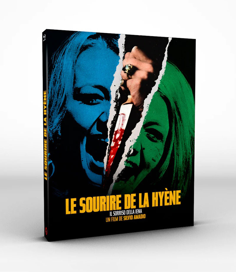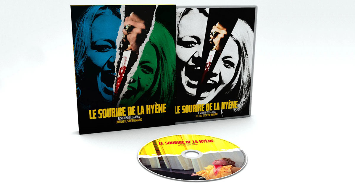 Séance de rattrapage pour l’édition Blu-ray française du Sourire de la Hyène, disponible depuis la fin 2024 sous la bannière Le Chat qui Fume, mais que l’on avait honteusement loupée au moment de sa sortie. Le film de Silvio Amadio arrive dans un écrin qui ferait ronronner n’importe quel collectionneur insomniaque. Le Blu-ray est logé dans un boîtier rigide protégé par un fourreau illustré, un duo qui joue sur deux ambiances : l’une éclatante, presque psychédélique, l’autre plus austère, comme si le film hésitait entre confession intime et carnaval meurtrier. Comme d’hab, cette édition du Sourire de la Hyène profite ici du travail graphique remarquable de Frédéric Domont, qui ne cherche pas la nostalgie facile, mais une réinterprétation élégante de l’affiche d’époque, avec ce sens du détail visuel qui lui est propre. Bref, un packaging qui attire l’œil sans sombrer dans le tape-à-l’œil, un équilibre rare dans le monde de l’édition vidéo.