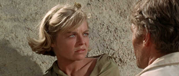 Les Sables du Kalahari s’amuse aussi à détourner les codes du film d’aventure. Pas de héros rutilants, pas de punchlines calibrées pour marquer le spectateur, juste des êtres humains qui transpirent, doutent, et parfois se comportent comme de véritables babouins. Le film montre comment la nature, immense et indifférente, renvoie chacun à ses obsessions les plus inavouables. Une scène où un personnage observe les singes avec une fascination presque gênante devient un moment clé : la caméra, placée légèrement en contrebas, accentue la sensation de glissement moral. Les Sables du Kalahari transforme alors la simple survie en miroir déformant de l’humanité. D’ailleurs, tout au long du récit, la mise en scène de Cy Endfield respire la maîtrise tranquille, presque sournoise. Les mouvements de caméra, souvent lents, donnent l’impression que le désert lui-même surveille les protagonistes, et les gros plans sur les visages brûlés par le soleil révèlent des micro-expressions qui racontent plus que les dialogues : peur, désir, jalousie, parfois même une pointe de lubricité mal placée.