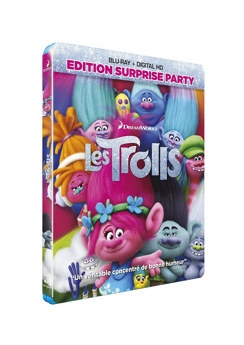 Autant être clair d’entrée de jeu, le Blu-ray des Trolls édité par Dreamworks Animation SKG nous propose une expérience Home Video optimale, et un transfert tout simplement épatant. Les couleurs sont littéralement explosives, les textures et le piqué sont littéralement au taquet, en deux mots comme en cent, l’éditeur nous offre ici une copie Haute Définition du film absolument renversante et quasi-irréprochable. Côté son, la version française, dont le doublage est assuré, entre autres, par Louane et M. Pokora, est proposée dans un mixage DTS 5.1 extrêmement efficace, riche en effets de spatialisation en tous genre. Un poil plus ample et plus fine, la version originale mixée en DTS-HD Master Audio 7.1 nous propose encore plus d’effets cartoonesques, littéralement dispatchés dans tous les coins de la pièce, proposant de ce fait une expérience vraiment extraordinaire et mémorable. Le film est de plus également proposé en mode « karaoké » ou dans mode « fun » interactif, des couleurs à l’écran permettant au spectateur de faire partir des feux d’artifices et autres joyeusetés pendant le visionnage du film, en appuyant simplement sur un bouton de sa télécommande. Il est dommage cela dit que les karaokés soient proposés uniquement en version originale.