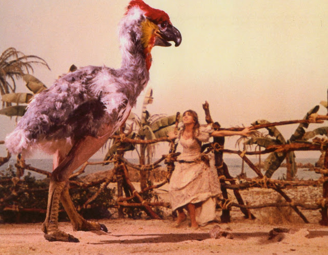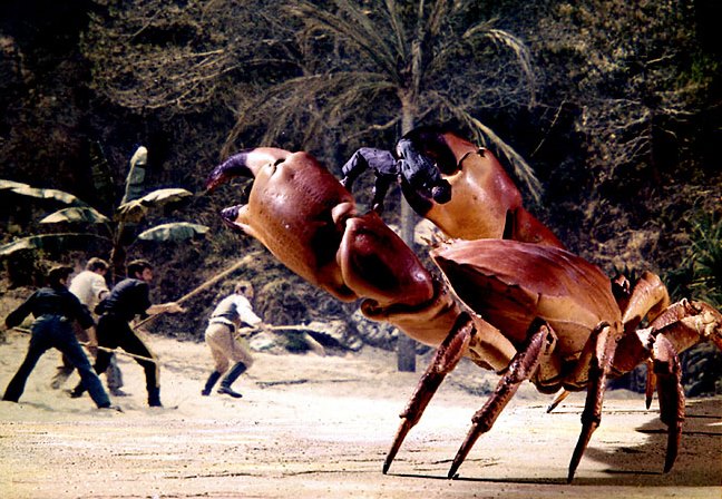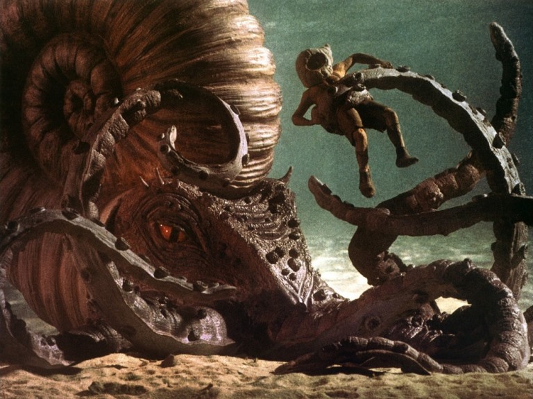 Le film enchaîne donc les véritables prouesses formelles, qui remontent à un temps que les moins de vingt ans ne peuvent pas connaître – une époque bénie, bien avant le tout en CGI, bien avant même la révolution de La guerre des étoiles, où les techniques d’effets spéciaux reposaient sur une vision et des méthodes « humaines », et n’étaient pas du ressort exclusif d’une poignée de techniciens concentrés devant un écran d’ordinateur. Et on admettra volontiers à quel point la redécouverte de L’île mystérieuse ramènera immédiatement le spectateur en enfance, l’emportant avec lui dès le trajet des personnages en ballon, puis lui proposant de vibrer au rythme de leurs incroyables batailles contre des animaux gigantesques : un crabe, une pieuvre, une abeille, une espèce de poulet préhistorique… Le tout s’imposant de plus grâce à de superbes matte-paintings, décors grandioses, à la fois naïfs et majestueux.