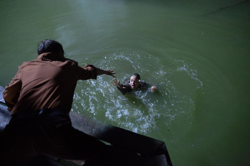 En particulier, les amateurs de photo brumeuse et de compositions de plans à tomber par terre risquent bel et bien de redresser la tête avec intérêt, et ce dès les premiers plans du film : la direction photo de Mermaid – Le lac des âmes perdues, signée Anton Zenkovich, est tout simplement somptueuse, qu’il s’agisse des scènes en extérieur – le lac et ses alentours – ou même en intérieur – la maison abandonnée, et même l’appartement des deux personnages principaux, recouvert de bâches de plastique transparentes, qui évoque de fait un peu l’appartement du remake de Toolbox murders (Tobe Hooper, 2004). Ces visuels superbes fonctionneront à coup sûr à plein régime sur l’imaginaire du spectateur, et rehausseront automatiquement son intérêt : on suivra dès lors le déroulement très balisé de cette intrigue certes sans la moindre surprise à l’horizon, mais aussi et surtout sans le moindre ennui. Ce qui, vous l’admettrez, est déjà beaucoup !