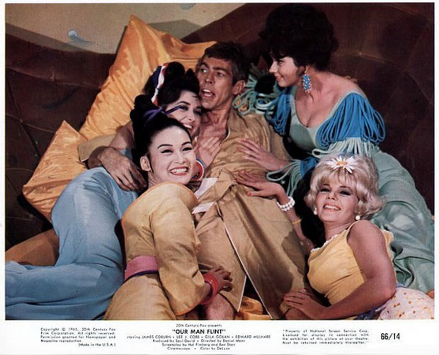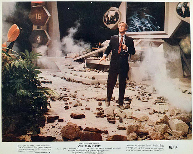 Incarné par un James Coburn en mode lover, sourire ultra-brite et muscles saillants, Notre homme Flint met donc en scène une réponse américaine à l’agent 007 au service de sa majesté James Bond. Comme son modèle britannique, le film de Daniel Mann développe un récit d’espionnage en mode décontracté, avec un héros imperturbable confronté aux personnages les plus hauts en couleurs et aux situations les plus rocambolesques. Ainsi, Flint affrontera dans ce premier épisode un méchant mégalo ayant installé sa base secrète au cœur d’un volcan et disposant d’une machine capable de contrôler la météo – idée qui serait d’ailleurs reprise trente ans plus tard dans l’adaptation cinématographique de Chapeau melon et bottes de cuir (Jeremiah Chechick, 1998). Si on n’est pas toujours vraiment sûr de saisir les tenants et aboutissants de l’intrigue, Notre homme Flint se rattrape néanmoins en misant tout sur son ambiance typiquement 60’s, aussi sexy que détendue, qui contribue nettement à faire du film un petit plaisir sucré aussi inoffensif que charmant, d’autant plus attachant dans son genre qu’il s’avère visuellement très soigné.