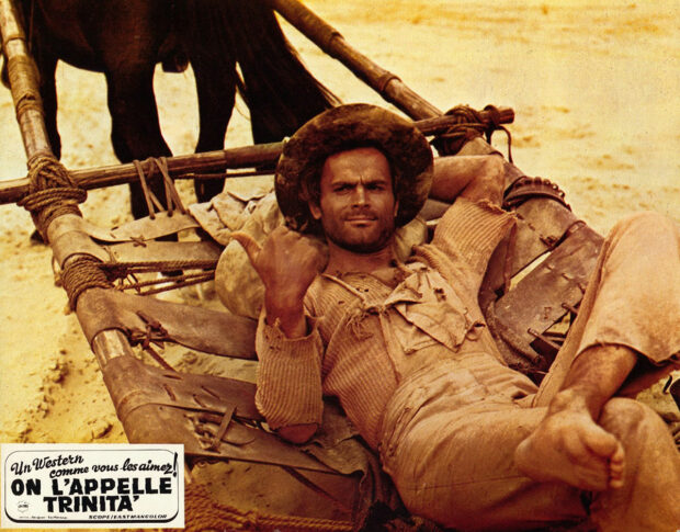 Le charme d’On l’appelle Trinita tient à cette manière de jouer avec les attentes sans jamais les mépriser. Le film connaît ses ancêtres – et notamment la Sainte Trinité des Sergio, à savoir Leone, Corbucci, Sollima – mais il préfère leur répondre par un clin d’œil plutôt que par un duel. Là où les héros du western spaghetti avançaient comme des statues de granit, Trinita se traîne, s’affale, s’étire, comme un chat de saloon qui aurait trop bien mangé. Le film transforme la nonchalance en arme comique, et la lenteur en style. Chaque geste de Terence Hill semble calculé pour désamorcer la tension, comme si le personnage refusait obstinément de prendre le monde au sérieux. On l’appelle Trinita devient alors une sorte de western zen, où la violence est remplacée par des baffes chorégraphiées et où les fusillades ressemblent à des disputes de cour d’école.