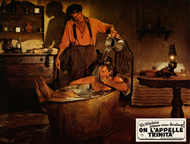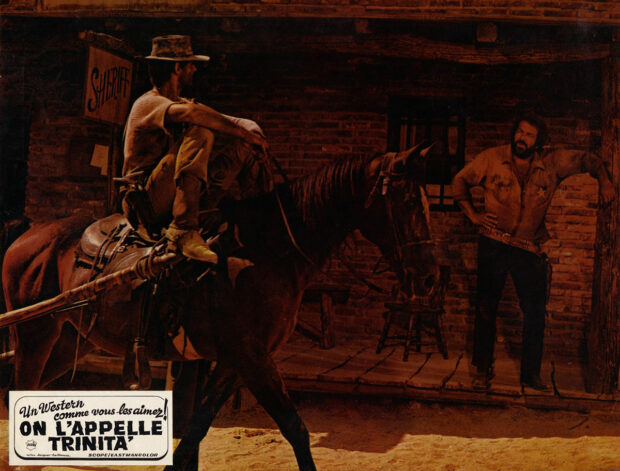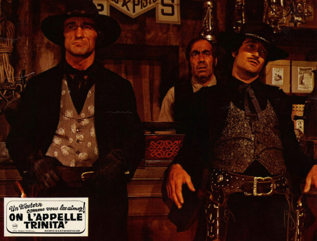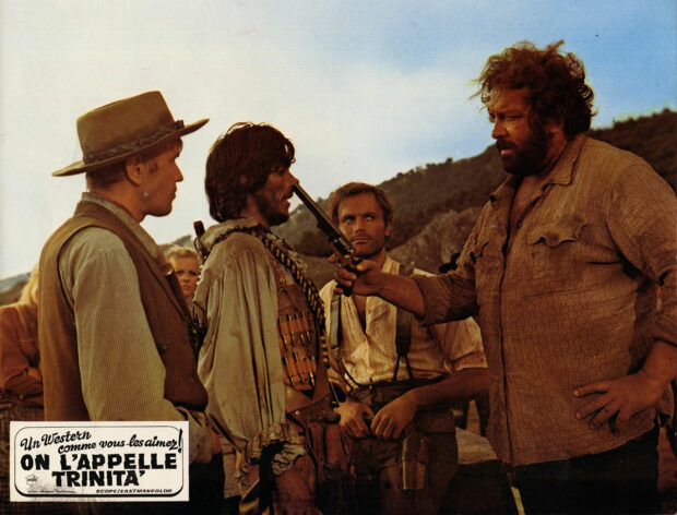 Cette tonalité légère n’empêche pas On l’appelle Trinita d’être un vrai western. Les décors, les costumes, les cadrages héritent directement du spaghetti italien, avec ses paysages arides, ses villages poussiéreux et ses méchants moustachus qui semblent avoir été sculptés dans du cuir tanné. Mais le film détourne ces éléments pour en faire des ressorts comiques : un méchant trop sûr de lui devient un punching-ball humain, un duel trop long se transforme en numéro burlesque, une bagarre de saloon vire à la danse folklorique. Le western, ici, n’est pas moqué : il est célébré, mais avec un sourire en coin. On l’appelle Trinita rappelle que le cinéma populaire peut se réinventer sans perdre son âme, simplement en changeant de ton.