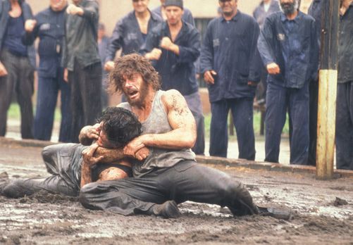 Car si Replicant demeure un excellent actioner, remettant sur le devant de la scène l’obsession de Van Damme et de Lam pour la notion de « double », il demeure tout de même selon nous, et au même titre que Risque maximum,  un « brouillon » de ce gros morceau de péloche qu’est In hell. Il n’est d’ailleurs pas interdit de voir, et Metropolitan nous facilite la tâche en mettant les deux films dos à dos sur un seul et même Blu-ray, In hell comme une suite directe de Replicant. En effet, et là attention ça va [SPOILER] sévère, la fin de Replicant nous montre le replicant incarné par Van Damme passer pour mort et retrouver la prostituée dont il est tombé amoureux, interprétée par Marnie Alton. Pour vivre heureux, ces deux-là vont devoir vivre cachés : l’un parce qu’il est un « produit » du gouvernement d’une valeur d’un million de dollars, l’autre parce qu’elle va, pour s’émanciper, devoir échapper aux griffes de son mac. Et que voit-on au début de In hell ? Un couple d’américains exilés en Russie, interprétés par Jean-Claude Van Damme et Marnie Alton, dont on comprend, dès les premières minutes du film, les difficultés à vivre loin de leur mère patrie, le dialogue nous indiquant que la jeune femme souffre d’être loin de ses amies. On suppose donc dès le début qu’ils vivent là sous une fausse identité, et la suite du film ne contredira jamais cette impression : la propension du personnage de Van Damme, décrit comme un simple ouvrier de chantier, à se battre de façon remarquable, l’absence de flash-backs antérieurs aux moments de bonheur passés aux côtés de sa femme (comme s’il n’avait pas de souvenir avant ceux-ci), et enfin, dans la fameuse séquence durant laquelle il refuse de se battre, sa façon de s’accroupir exactement de la même manière que celle utilisée pendant la première séquence le mettant en scène dans Replicant. Autant d’indices qui nous font penser que dans l’esprit de Ringo Lam, cette déduction était tout à fait possible, voire logique [FIN DES SPOILERS]. De fait, on aura tendance à considérer Replicant et In hell comme un diptyque constitué de deux films inséparables et fonctionnant parfaitement l’un avec l’autre.