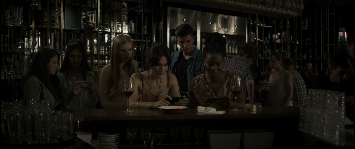 Et le moins que l’on puisse dire, c’est que The devil’s hour tire vraiment à boulets rouges sur la génération Web. Bien sûr, Damien LeVeck n’est pas le premier à amener l’horreur dans l’ère des médias sociaux, mais l’idée du « hoax » qui se mord la queue et se retourne contre son créateur est amusante, d’autant qu’elle arrive ici accompagnée du décorum traditionnel du film de possession, avec tous les clichés qu’il peut se trimballer depuis L’exorciste, ce qui au final pourra occasionner quelques moments plutôt inattendus et réjouissants. Disons qu’en vieux cons que nous sommes, on se réjouit toujours de voir un cinéaste essayer de secouer le cocotier, surtout à une époque où les gens passent l’essentiel de leur temps à cacher leurs visages derrière leurs téléphones ou leurs écrans d’ordinateur, sans se préoccuper des interactions humaines. Ici, le but caché du démon possédant le personnage d’Alix Angelis sera finalement ni plus ni moins de permettre aux différents protagonistes du film de renouer avec leur « humanité » : avouons qu’il est plutôt marrant qu’une entité supposée démoniaque ait en réalité un but aussi altruiste. Dans le même état d’esprit, la fin du film réservant un sort peu enviable aux milliers de « voyeurs » des médias sociaux…