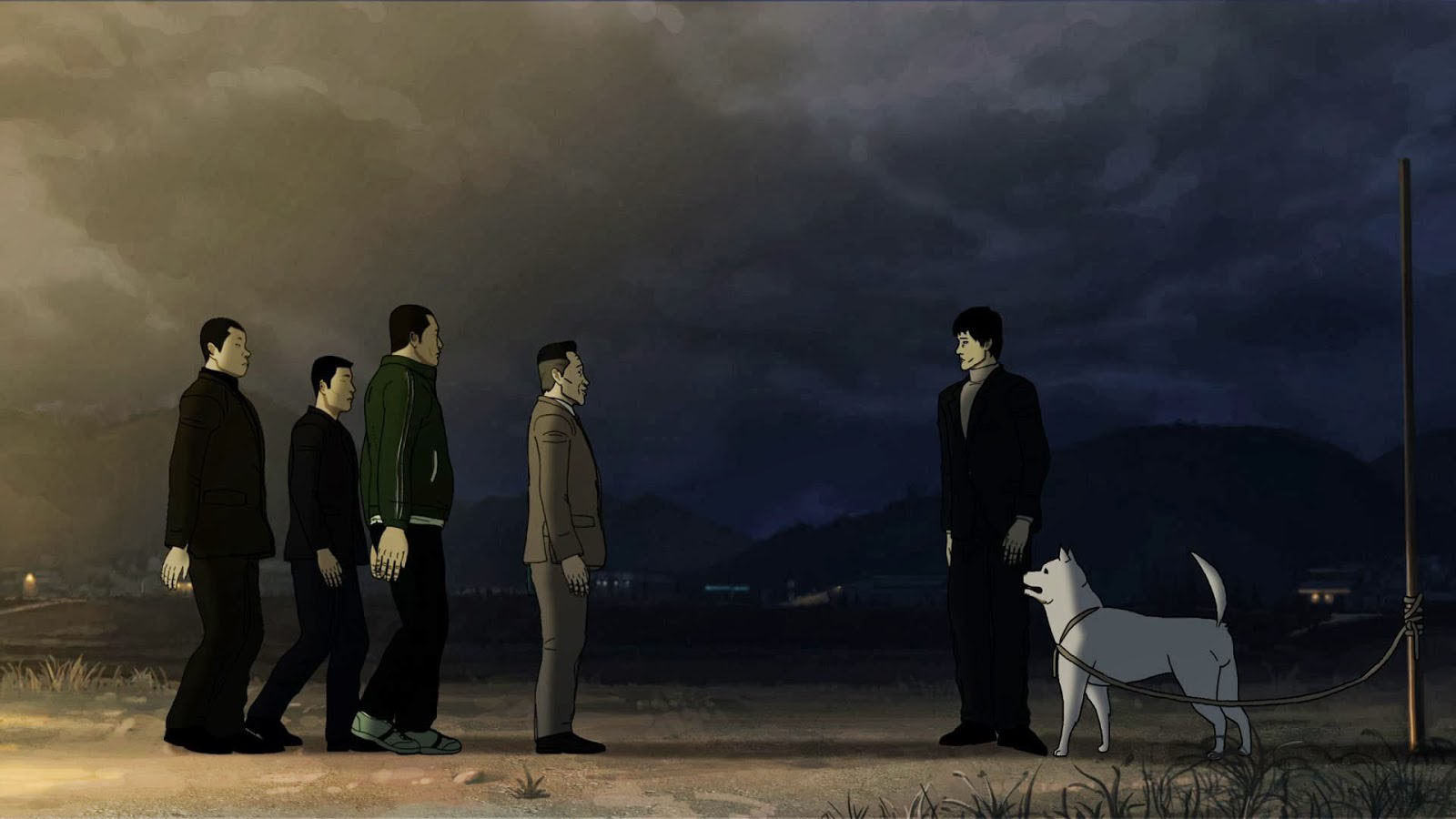 Comme les autres films de son auteur, The fake n’est peuplé que de personnages foncièrement antipathiques : ouvertement faibles, violents, manipulateurs et/ou enclins au mensonge, ils forment la substantifique moelle d’un récit forcément très noir, où aucun espoir quant à la possibilité d’un avenir ou d’une société meilleurs ne semble percer au bout du tunnel. Au point même que l’on finisse par se dire que si The fake avait été tourné en « live », sans la distance qu’implique presque automatiquement l’animation vis-à-vis du public, son ambiance aurait probablement été trop noire, suffocante, déprimante. Pas l’ombre de la plus petite trace d’humour au cœur de The fake, mais l’animation crée finalement une espèce d’ambiance teintée de poésie sombre, ne serait-ce que dans l’utilisation de décors bucoliques et vraiment très beaux, en contradiction totale avec ce qui nous est montré.