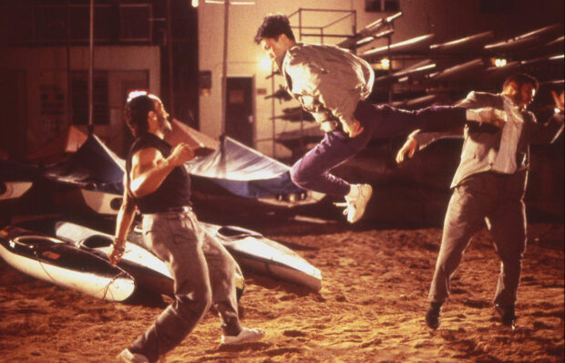 Affrontements violents, cascades brutales, chargeurs littéralement vidés dans le corps des dealers : Tiger Cage – La Rançon des traîtres s’offre une entrée en matière électrisante, pleine de bruit et de fureur. Le contraste n’en sera que plus brutal lorsque la séquence suivante nous proposera de retrouver les mêmes flics à l’occasion d’une petite fête de pré-mariage. La violence décomplexée laisse ici la place aux rires et à l’amusement bon enfant, dans une ambiance volontairement caricaturale, et tout au long de l’intrigue, le film de Yuen Woo-ping alternera entre les séquences d’action survoltées et les séquences à visée humoristique, dont l’impact sur nos zygomatiques ne sera que peu probant. Mais qu’importe dans le fond, car même s’il ne revient à l’action que par intermittence, le film parvient tout de même à s’imposer comme une bonne claque bien nerveuse lors de ses passages les plus intenses.