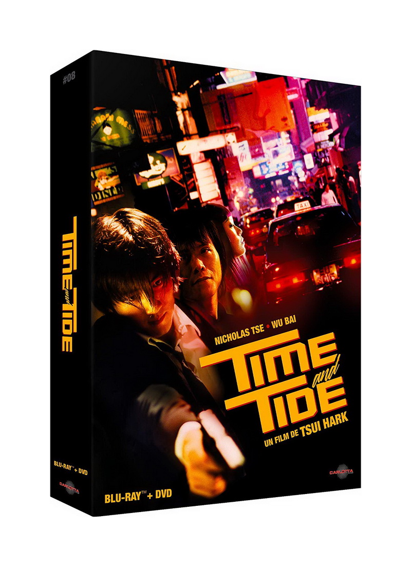 Huitième film à paraître chez Carlotta Films dans la collection « Édition Prestige limitée » (après des films tels que Cinq et la peau, Comme un chien enragé ou encore The last movie), le petit chef d’œuvre de Tsui Hark Time and Tide s’offre vraiment un coffret de grande classe. Il s’agit en effet d’une édition limitée à 3000 exemplaires qui s’imposera d’entrée de jeu comme un « bel objet », contenant non seulement le Blu-ray et le DVD du film mais également tout un tas de « goodies » réunis pour l’occasion : le fac-similé du dossier de presse d’époque, un livret exclusif de 28 pages contenant un fac-similé du dossier dédié à Tsui Hark dans Le cinéphage n°13 ainsi qu’un essai inédit rédigé par Arnaud Lanuque intitulé « La renaissance par le chaos », l’affiche du film en 40 par 60 et enfin, 16 reproductions de photos d’exploitation. On a donc entre les mains un véritable et bel objet de collection, auquel l’éditeur rajoutera, bien sûr, quelques suppléments sur le Blu-ray du film.