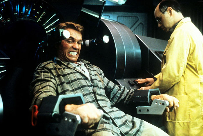 Une fois que le héros constamment malmené – on n’a pas osé les compter, mais ce film contient sans doute le nombre le plus élevé d’attaques physiques contre l’entre-jambe de Schwarzenegger dans toute la filmographie de l’acteur, symbole majeur de l’excès de testostérone – aura accompli sa mission qui équivaut, à peu de choses près, au sauvetage de l’humanité, il n’est pas pour autant prêt à faire définitivement la différence entre le rêve et la réalité. Il pense savoir dès lors qui sont les bons et qui les méchants. Ces derniers se distinguent d’ailleurs par leur côté profondément machiavélique, sous les traits de Michael Ironside et de Ronny Cox. Sauf que la notion du mal est beaucoup plus diffuse ici. Elle va jusqu’à pénétrer subtilement la structure psychologique de l’intrigue.