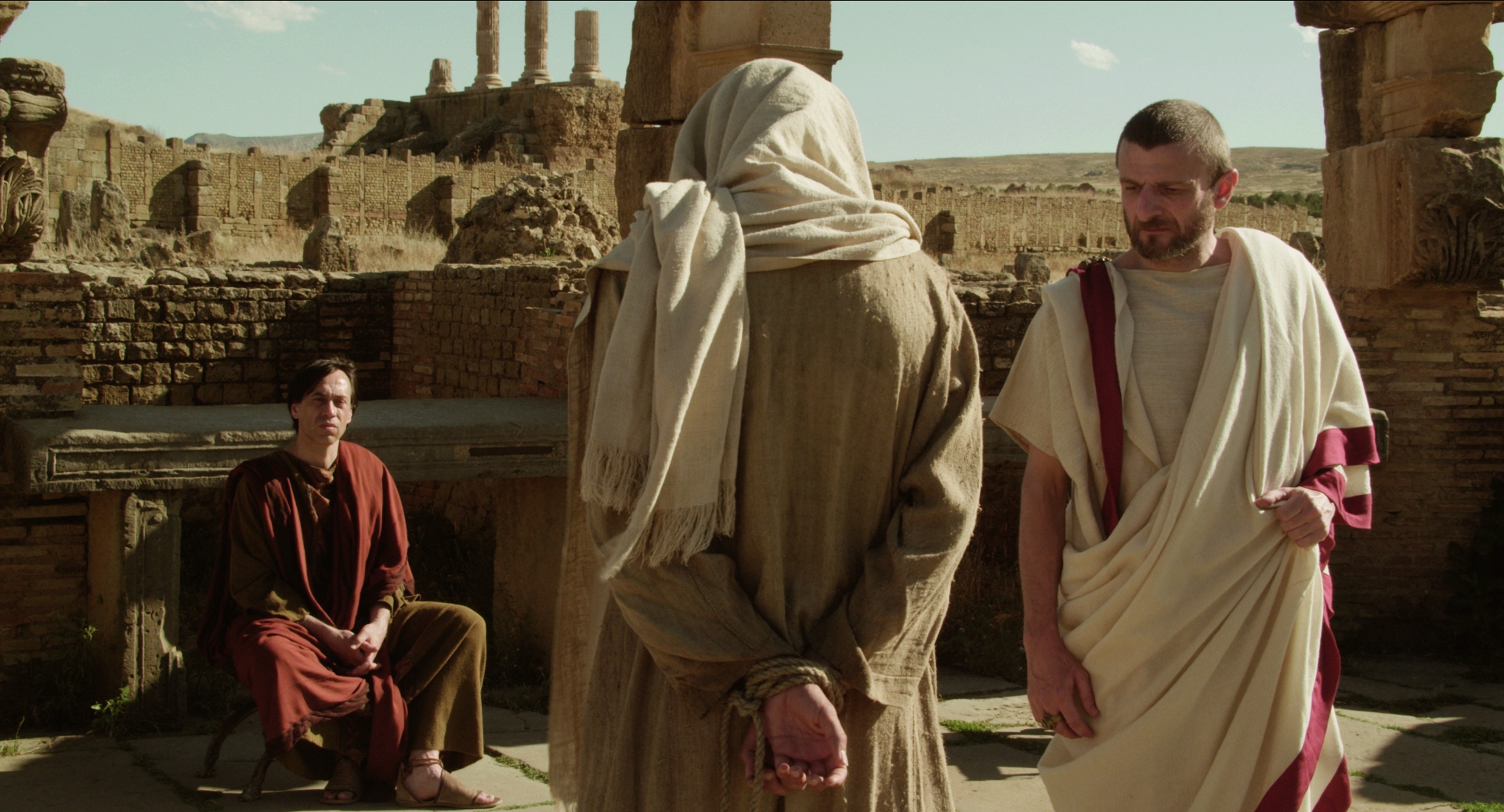 Histoire de Judas, dit le titre. En fait, le film de Rabah Ameur-Zaïmeche s’attache plutôt à décrire la relation entre Jésus et Judas, son très fidèle disciple. Si le titre du film insiste sur le nom de Judas, c’est probablement pour mettre l’accent sur le fait qu’il ne s’agit pas d’un énième acte d’accusation envers un disciple qui aurait trahi le Messie mais, tout au contraire, d’un acte de réhabilitation d’un personnage devenu l’archétype du traître et qui, à ce titre et depuis des siècles, a apporté de l’eau au moulin de tous les antisémitismes. Histoire de Judas se présente sous la forme d’un péplum, ou, plus exactement, d’un péplum « light », réalisé avec peu de moyens, sans effets spéciaux, sans véritable musique d’accompagnement, un film biblique mélangeant allégrement ancien et nouveau testament, un film de liberté montrant Jésus dans la parole et Judas dans l’action. Dès les premières images du film, cette action consiste pour lui, à monter au sommet d’une colline aride afin d’y retrouver Jésus, affaibli par un jeûne prolongé, et à le ramener sur son dos vers leur village où le duo fait l’objet d’un accueil chaleureux. Alors que Jésus continue de répandre sa parole, Judas continue d’agir : Jésus s’oppose verbalement au sacrifice des animaux, Judas détruit les cages ; Jésus pourfend verbalement les marchands du temple, Judas renverse leurs étalages. Lorsque Judas aperçoit un homme qui retranscrit par écrit les paroles de Jésus, il le chasse et rapporte ce fait à Jésus. Pas question de figer par l’écrit une parole vivante et adaptée à un moment précis, parole qui deviendrait alors pour toujours un dogme incontournable, indiscutable. Et d’envoyer Judas procéder à la destruction de ces écrits, geste qui, en l’éloignant de Jésus au moment de la passion, l’exonère de toute responsabilité dans la fin tragique de son ami : «Une petite injustice » qui, pour les romains, « vaut mieux qu’un grand désordre».