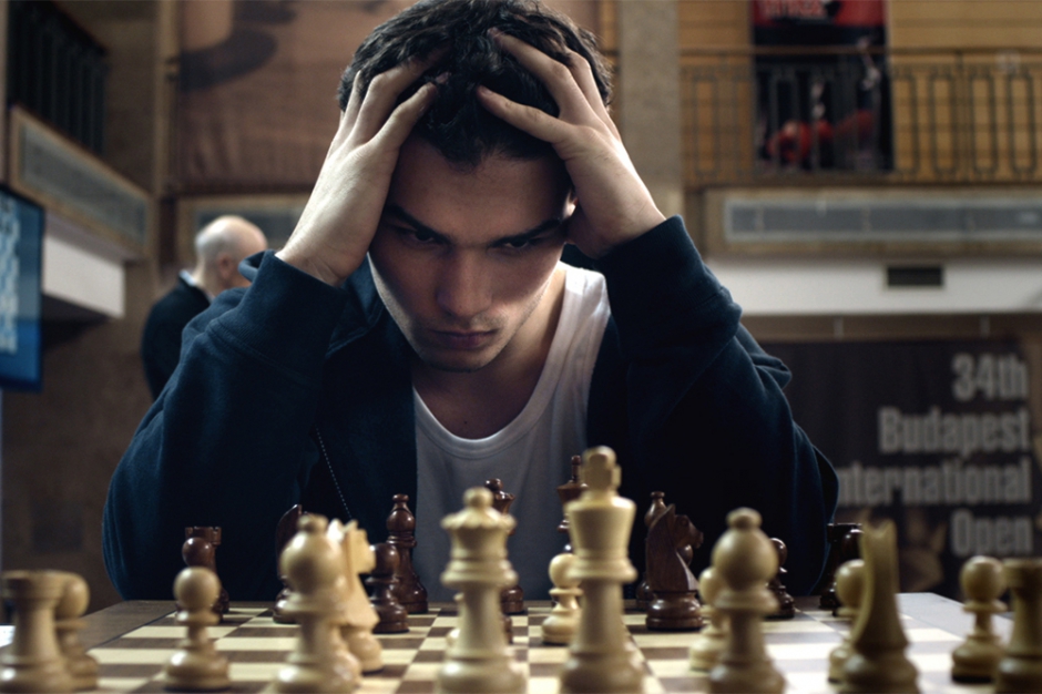 Une salle immense dans un grand hôtel de Budapest. Une bonne centaine de petites tables, sur chacune trône un échiquier et, de part et d’autres de ces tables, des joueurs. Une estrade abrite les parties les plus prestigieuses, parties que l’on peut suivre sur un écran et qui sont disséquées en direct par des commentateurs auxquels il n’est pas interdit d’affubler l’adjectif « sportifs ». Dans la seconde qui suit, le 34ème Tournoi International de Budapest va commencer. Il commence. Un seul participant manque encore à l’appel, le favori du tournoi, le français Cal Fournier, tout nouveau champion de France. Avec un retard bien calculé, il pénètre dans la salle, tel un boxeur qui s’apprête à monter sur le ring. Il s’installe. Il est ivre mort et s’endort. C’est ainsi qu’Elodie Namer, dont c’est le premier film, nous fait faire connaissance avec la star du clan français, un clan qui comprend quatre hommes entre 20 et 30 ans et Lou, une jeune femme d’une petite vingtaine d’années. Malgré la présence à leurs côtés de Viktor, coach de Cal et ancien vice-champion du monde d’échec, cette troupe se montre d’une immaturité confondante, passant son temps à jouer, dans tous les sens du mot, à se déguiser et à s’affronter à coup de paris, le plus souvent totalement stupides. Si Cal est arrivé dans cet état pour son premier match, c’est à la suite d’un de ces paris : gagner ou non ce match en venant d’ingurgiter une bouteille de téquila. De vrais sentiments, Cal n’en éprouve aucun. Il s’apparente plutôt à un robot qui serait programmé pour gagner et, tout au long d’une année, le monde autour de lui, qui se limite à des hôtels un peu partout dans le monde et à d’autres joueurs d’échec, n’est que prétexte à jeux et à paris. Même la relation qu’il entretient avec Lou est prétexte à des paris et n’a rien de sentimentale. Toutefois, pendant les sept jours que va durer ce tournoi de Budapest, Cal va évoluer, va devenir un homme, un véritable humain. Pourquoi ? Parce qu’un caillou va venir se nicher dans une chaussure. Ce caillou, c’est Max, un gamin de 8 ans, un véritable génie des échecs, autodidacte, ne rentrant dans aucun des moules connus en matière de tactique. Un gamin qui va venir torturer l’esprit de Cal dans lequel le film nous a plongé, le faire tanguer, le faire vaciller.