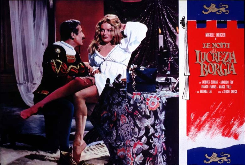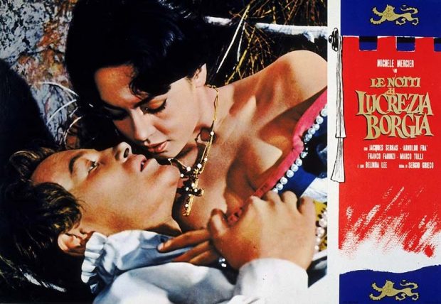 Si le genre est aujourd’hui malheureusement tombé en désuétude, le film de cape et d’épées a donc à son actif des dizaines de grands succès populaires tournés pendant les années 50/60 ; Les nuits de Lucrèce Borgia fait partie de cette mouvance, et en constitue même le parfait petit représentant, malgré un titre un peu racoleur fleurant bon la romance érotique dont nous régaleraient régulièrement les italiens durant les années 70. Réalisé en 1959 par Sergio Grieco, fier artisan ayant œuvré dans à peu près tous les genres du bis (Jules César contre les pirates, L’agent Gordon se déchaîne, Superman contre les robots, Ultime violence…), le film met en scène des acteurs en provenance de toute l’Europe : la cruelle Lucrèce est incarnée par la britannique Belinda Lee, le héros sans peur et sans reproche par le bondissant Jacques Sernas, tandis que l’objet de son amour pur et désintéressé prend les traits de Michèle Mercier, connue pour son interprétation d’Angélique, marquise des anges. L’Italie sera également à l’honneur avec des méchants impitoyables interprétés par Arnoldo Foà et Franco Fabrizi, tandis que le sympathique valet du héros sera incarné par Mario Tulli.