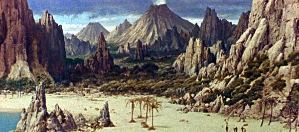 Le film enchaine donc les véritables prouesses formelles, qui remontent à un temps que les moins de vingt ans ne peuvent pas connaitre – une époque bénie, bien avant le tout en CGI, bien avant même la révolution de La guerre des étoiles, où les techniques d’effets spéciaux reposaient sur une vision et des méthodes « humaines », et n’étaient pas du ressort exclusif d’une poignée de techniciens concentrés devant un écran d’ordinateur. Et on admettra volontiers à quel point la redécouverte de L’île mystérieuse ramènera immédiatement le spectateur en enfance, l’emportant avec lui dès le trajet des personnages en ballon, puis lui proposant de vibrer au rythme de leurs incroyables batailles contre des animaux gigantesques : un crabe, une pieuvre, une abeille, une espèce de poulet préhistorique… Le tout s’imposant de plus grâce à de superbes matte-paintings, décors grandioses, à la fois naïfs et majestueux.