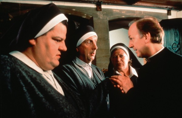 Mettons les voiles est donc une des quelques comédies dans lesquelles s’est illustré Eric Idle au début des années 90. Soyons clairs et nets cela dit : si cette comédie a su faire illusion à l’époque de sa sortie (je me souviens m’être bien bidonné enfant devant les tribulations de ces fausses nonnes en folie), le temps n’a pas forcément joué en sa faveur, et pour apprécier Mettons les voiles aujourd’hui, il faut vraiment être fan du talent comique d’Eric Idle et de son comparse Robbie Coltrane (futur Hagrid d’Harry Potter). Mais pour qui goutera à leur juste valeur les mimiques et la gouaille de ce formidable duo d’acteurs passera à coup sûr un excellent moment, d’autant qu’en plus de nos deux héros, on a également droit à une bonne sœur alcoolique pas piquée des hannetons, des gangsters de pacotille pas franchement doués et une jeune serveuse transie d’amour aussi mal voyante que Mr Magoo…