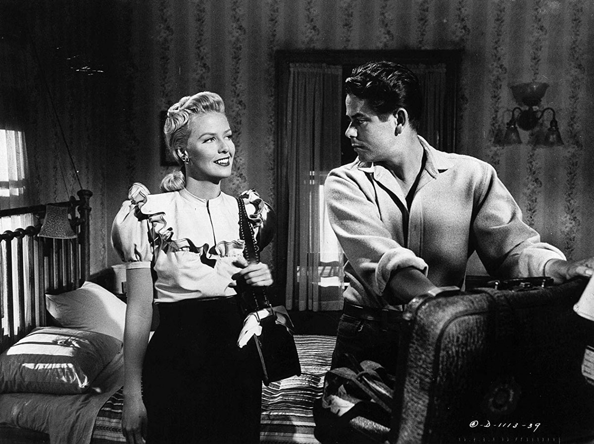 L’intrigue de Traquée est à la fois limpide et complexe : on y suivra un jeune gars (Glenn Ford, parfait) entreprenant, pour des raisons mystérieuses, une espèce de constante fuite en avant. Durant la séquence d’ouverture, le spectateur le découvrira en sueur, l’œil hagard, au volant d’un camion fou, traversant la ville en évitant de peu piétons et automobilistes. S’agit-il d’un évadé de prison ? D’un truand en cavale, venant tout juste par exemple de commettre un braquage ? A l’issue de sa course folle, l’inévitable accident. Et l’on découvrira qu’il s’agit juste d’un coursier, à qui on aura fourni un camion aux freins défectueux. Pour se calmer de ses émotions, direction le bar. La Paloma en l’occurrence, un lieu interlope doté d’une petite salle de jeux clandestine et d’une serveuse semblant un peu trop intéressée par ce nouvel arrivant. Tellement intéressée qu’elle paiera la caution pour lui éviter de faire 10 jours de prison, ce qui lui aurait permis, d’après ses dires, de « découvrir la prison dans cet État ». Une des rares indications que nous donnera le film sur le fait que le personnage donne l’impression de fuir, quelque-chose ou quelqu’un… Le paiement de la caution et le rapprochement entre les deux personnages représente bien sûr le début d’un engrenage maléfique. Mike Lambert (Michel Lambert dans la VF) tombera donc dans les griffes de Paula, interprétée par Janis Carter, Femme Fatale au sens le plus littéral qui soit puisque tous les hommes passant entre ses bras connaîtront un destin funeste.