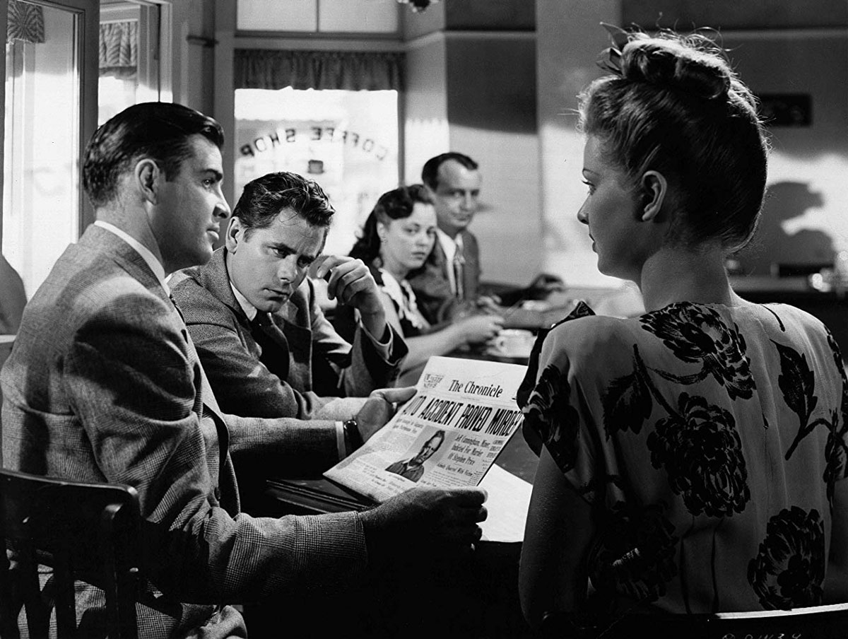 Le scenario de Traquée est par ailleurs aussi simple que brillant. Si on ignore tout de leur passé, la caractérisation des trois personnages principaux est habile, leurs motivations (crapuleuses pour deux d’entre eux, honorables pour l’autre) passant avant tout le reste et suffisant à expliquer les différents rebondissements de l’intrigue. D’un point de vue formel, la réalisation est élégante, efficace, la lumière en clair-obscurs donne au film un cachet visuel très intéressant, et les décors s’imposant comme des passages obligés du genre sont bien présents (la route escarpée et dangereuse, la banque, le nid douillet du couple illégitime…), de même que les clins d’yeux aux classiques du Film Noir (Le facteur sonne toujours deux fois, Assurance sur la mort…), ce qui fait qu’au final, le film de Richard Wallace se révèle une étonnante série B, rapide, nerveuse et parfaitement rythmée. Le personnage de Paula, à qui Janis Carter parvient à donner une humanité inattendue, s’impose par ailleurs comme l’une des Femmes Fatales les plus marquantes du genre : l’absence d’un background solide qui permettrait d’expliquer les raisons pour lesquelles elle prévoyait, dès le départ, de « doubler » son amant et de disparaître avec le magot, la façon dont elle tente de manipuler le personnage de Lambert – pour, on le suppose, mieux s’en débarrasser par la suite – en font un des personnages féminins les plus impitoyables et les plus détestables dont ait pu accoucher le Film Noir… Et donc paradoxalement l’un des plus réjouissants et mémorables !