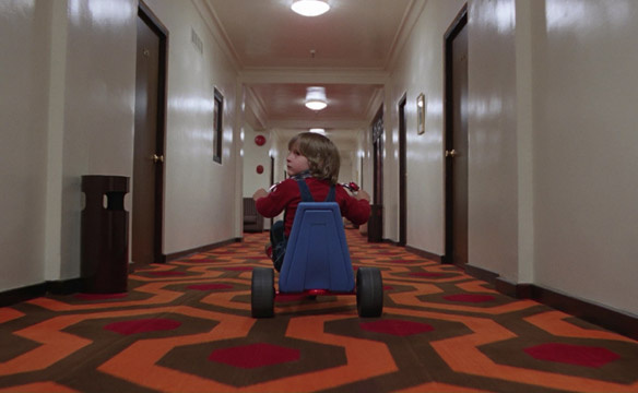 Un conseil, si vous êtes claustrophobes, profitez bien des plans d’ouverture dans les montagnes. Car même si l’hôtel est incroyablement vaste, sa présence devient tellement oppressante au long du film que vous étoufferez. Après une longue introduction et un entretien au cours duquel Jack assure qu’il n’a pas peur de l‘isolement qu’il va subir pendant des mois (renforcé dans le film par l’arrivée d’une tempête), la famille doit visiter les lieux et Danny voit une première fois les mystérieuses jumelles. Il découvre alors que quelqu’un d’autre a des capacités  » télépathiques « , Dick Hallorann, chef cuisinier à l’hôtel. Plusieurs choses à noter : c’est une des premières fois qu’un tournage utilise la Steadicam, permettant de dissocier les mouvements de la caméra et les mouvements de l’opérateur. Cela permet de réaliser des plans comme ceux où l’on suit Danny sur son vélo dans les couloirs de l’Overlook. Deuxièmement, les scènes les plus connues du film sont des ajouts, non présentes dans le livre : le sang qui s’échappe de l’ascenseur ou encore le  » all work and no play makes Jack a dull boy  » tapé indéfiniment à la machine. Le reste du film est un chassé-croisé psychologique entre une femme qui assiste à la dégradation mentale de son mari sans savoir quoi faire, un fils qui sent le danger arriver grâce à ses pouvoirs, et un père qui pactise avec les forces obscures de l’hôtel. Le tout agrémenté de scènes marquantes comme la rencontre avec le barman dans la salle de bal ou la poursuite dans le labyrinthe.