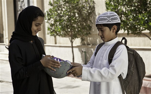 Pour nous montrer la condition féminine dans son pays, l’Arabie Saoudite, la réalisatrice Haifaa Al Mansour a choisi de nous raconter l’histoire de Wadjda, une fillette entrant dans l’adolescente. Parler de Wadjda permet en effet de montrer les conditions de vie de sa mère, comment elle se situe face à son mari, ce qu’elle pense et comment elle évolue lorsque son mari décide de transformer l’horizon de la famille. Parler de Wadjda permet de montrer le degré d’endoctrinement d’une directrice d’école. Parler de Wadjda elle-même, enfin, c’est déjà, malgré son jeune âge, parler de la condition féminine : en effet, en Arabie Saoudite, c’est un âge où les autorités (entendez par là les autorités religieuses) commencent à considérer que les filles n’ont plus droit aux « libertés » laissées aux petites filles et qu’elles doivent commencer à se plier aux règles strictes liées au statut de femme. Dans ces conditions, que Wadjda puisse rêver de la possession d’un vélo afin de faire la course avec son meilleur copain, cela est totalement inimaginable, que ce soit pour ses parents ou pour la directrice de son école. Seulement voilà : Wadjda a non seulement un caractère plutôt rebelle, mais en plus, elle est du genre têtu. Elle qui connaît très mal le Coran va se mettre à l’étudier très sérieusement le jour où elle apprend que son école organise une compétition comprenant deux volets : la connaissance de ce livre sacré et la psalmodie de certains de ses versets. Un seul but pour elle : triompher dans cette compétition, la somme allouée à la gagnante permettant l’achat du vélo de ses rêves.